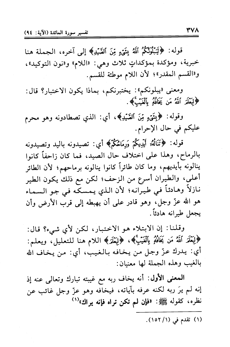 وقلنا: إن الابتلاء هو الاختبار، لكن لأي شيء؟ قال: {لِيَعْلَمَ اللَّهُ مَنْ يَخَافُهُ بِالْغَيْبِ}، {لِيَعْلَمَ} اللام هنا للتعليل، ويعلم: أي: يدرك عزّ وجل من يخافه بالغيب، أي: من يخاف الله بالغيب وهذه الجملة لها معنيان: