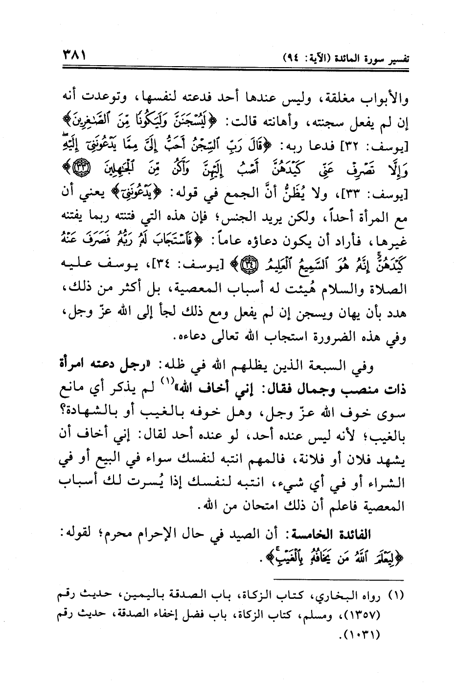 وفي السبعة الذين يظلهم الله في ظله: "رجل دعته امرأة ذات منصب وجمال فقال: إني أخاف الله" (¬١) لم يذكر أي مانع سوى خوف الله عزّ وجل، وهل خوفه بالغيب أو بالشهادة؛ بالغيب؛ لأنه ليس عنده أحد، لو عنده أحد لقال: إني أخاف أن يشهد فلان أو فلانة، فالمهم انتبه لنفسك سواء في البيع أو في الشراء أو في أي شيء، انتبه لنفسك إذا يُسرت لك أسباب المعصية فاعلم أن ذلك امتحان من الله.