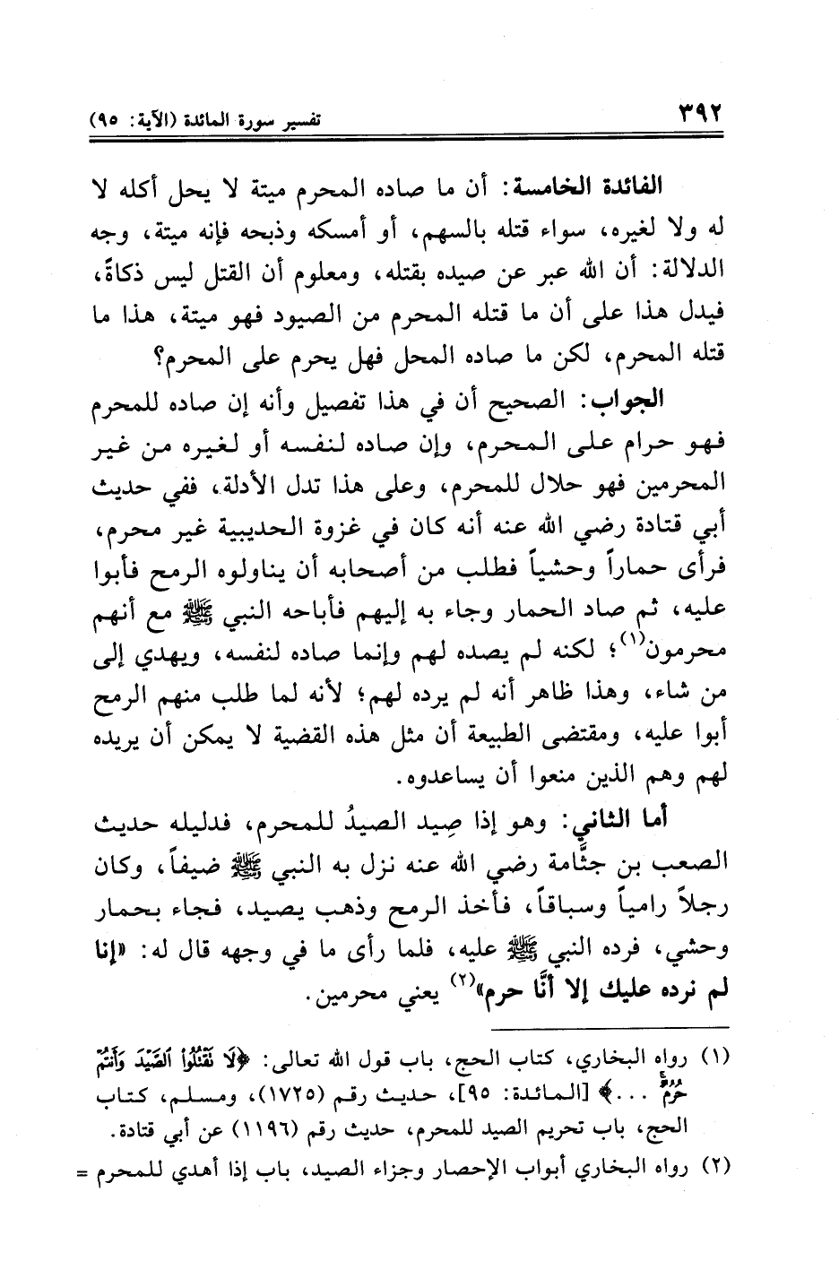 (¬١) رواه البخاري، كتاب الحج، باب قول الله تعالى: {لَا تَقْتُلُوا الصَّيْدَ وَأَنْتُمْ حُرُمٌ ... } [المائدة: ٩٥]، حديث رقم (١٧٢٥)، ومسلم، كتاب الحج، باب تحريم الصيد للمحرم، حديث رقم (١١٩٦) عن أبي قتادة.