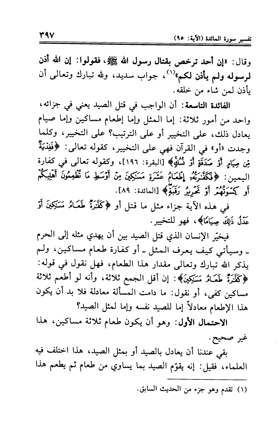 الفائدة التاسعة: أن الواجب في قتل الصيد يعني في جزائه، واحد من أمور ثلاثة: إما المثل وإما إطعام مساكين وإما صيام يعادل ذلك، على التخيير أو على الترتيب؟ على التخيير، وكلما وجدت "أو" في القرآن فهي على التخيير، كقوله تعالى: {فَفِدْيَةٌ مِنْ صِيَامٍ أَوْ صَدَقَةٍ أَوْ نُسُكٍ} [لبقرة: ١٩٦]، وكقوله تعالى في كفارة اليمين: {فَكَفَّارَتُهُ إِطْعَامُ عَشَرَةِ مَسَاكِينَ مِنْ أَوْسَطِ مَا تُطْعِمُونَ أَهْلِيكُمْ أَوْ كِسْوَتُهُمْ أَوْ تَحْرِيرُ رَقَبَةٍ} [المائدة: ٨٩].