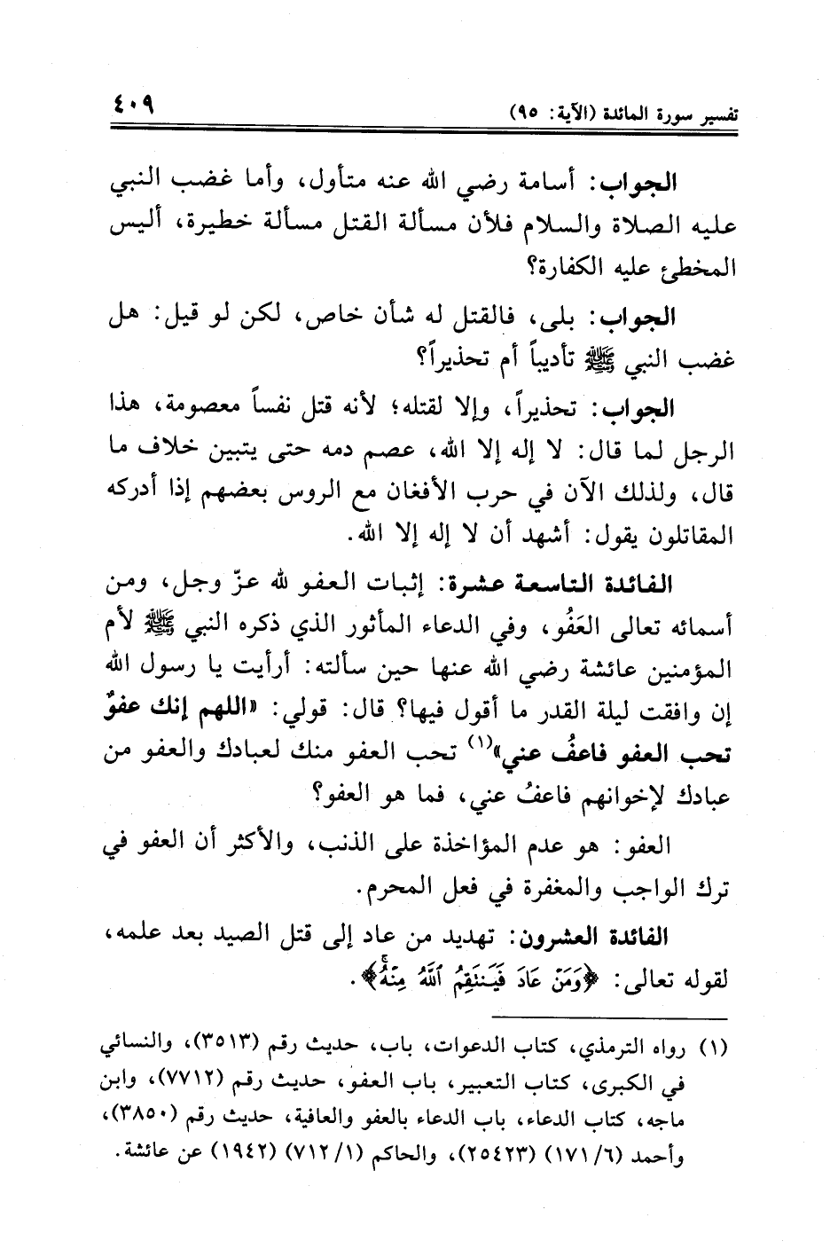 الفائدة التاسعة عشرة: إثبات العفو لله عزّ وجل، ومن أسمائه تعالى العَفُو، وفي الدعاء المأثور الذي ذكره النبي - صلى الله عليه وسلم - لأم المؤمنين عائشة رضي الله عنها حين سألته: أرأيت يا رسول الله إن وافقت ليلة القدر ما أقول فيها؟ - قال: قولي: "اللهم إنك عفوٌ تحب العفو فاعفُ عني" (¬١) تحب العفو منك لعبادك والعفو من عبادك لإخوانهم فاعفُ عني، فما هو العفو؟
