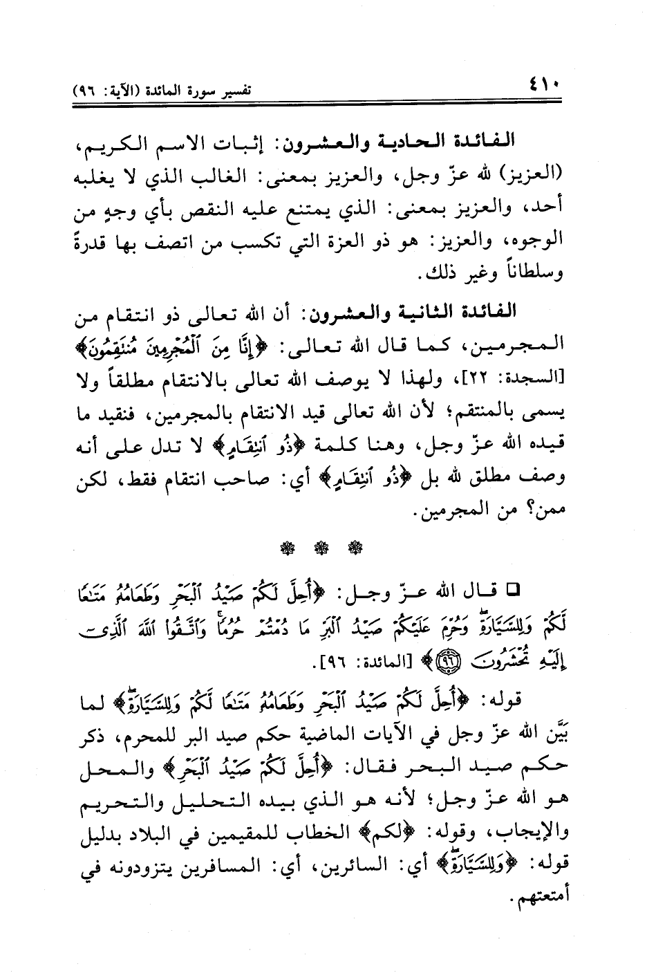 الفائدة الثانية والعشرون: أن الله تعالى ذو انتقام من المجرمين، كما قال الله تعالى: {إِنَّا مِنَ الْمُجْرِمِينَ مُنْتَقِمُونَ} [السجدة: ٢٢]، ولهذا لا يوصف الله تعالى بالانتقام مطلقًا ولا يسمى بالمنتقم؛ لأن الله تعالى قيد الانتقام بالمجرمين، فنقيد ما قيده الله عزّ وجل، وهنا كلمة {ذُو انْتِقَامٍ} لا تدل على أنه وصف مطلق لله بل {ذُو انْتِقَامٍ} أي: صاحب انتقام فقط، لكن ممن؟ من المجرمين.