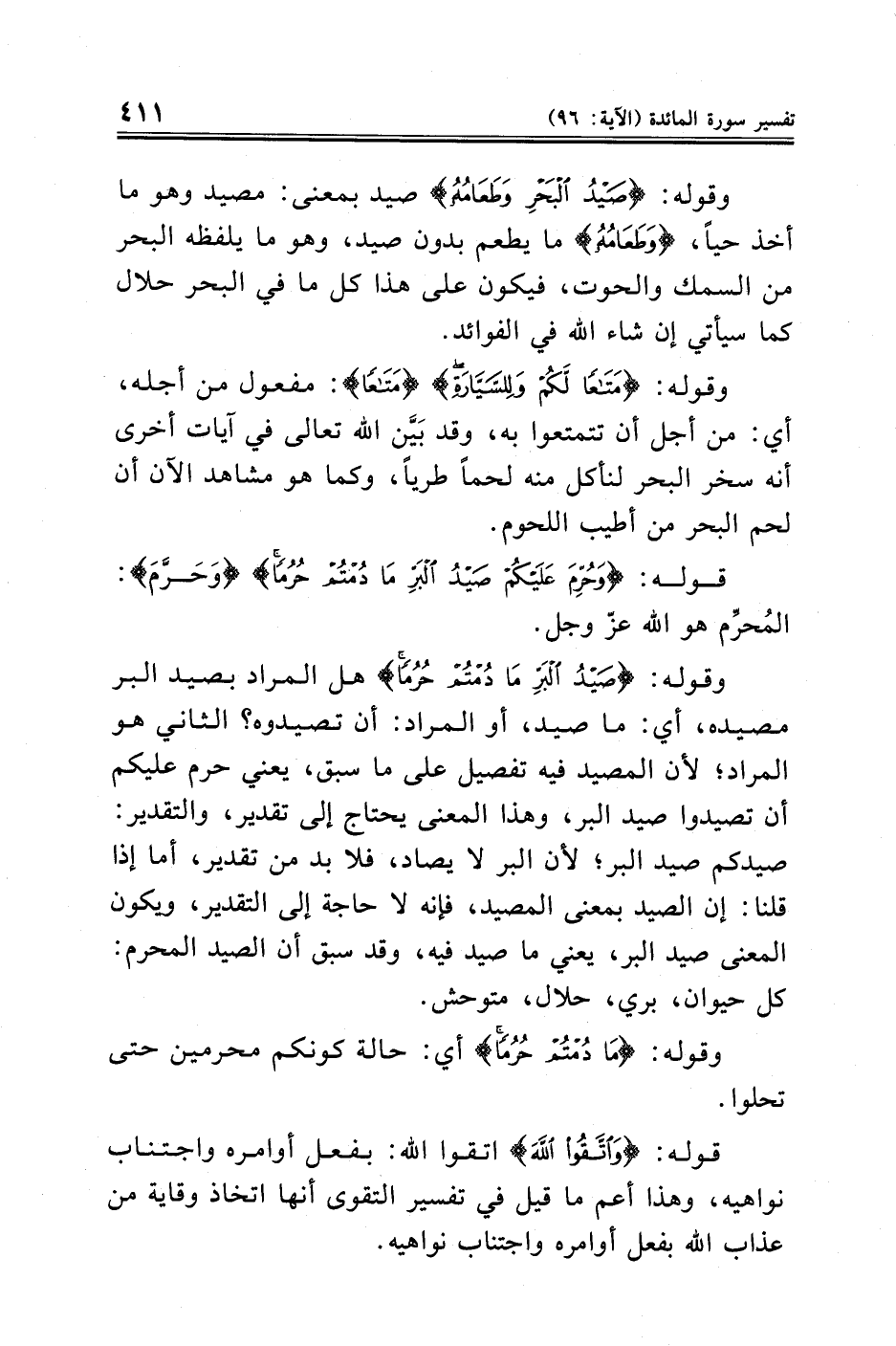 وقوله: {صَيْدُ الْبَرِّ مَا دُمْتُمْ حُرُمًا} هل المراد بصيد البر مصيده، أي: ما صيد، أو المراد: أن تصيدوه؟ الثاني هو المراد؛ لأن المصيد فيه تفصيل على ما سبق، يعني حرم عليكم أن تصيدوا صيد البر، وهذا المعنى يحتاج إلى تقدير، والتقدير: صيدكم صيد البر؛ لأن البر لا يصاد، فلا بد من تقدير، أما إذا قلنا: إن الصيد بمعنى المصيد، فإنه لا حاجة إلى التقدير، ويكون المعنى صيد البر، يعني ما صيد فيه، وقد سبق أن الصيد المحرم: كل حيوان، بري، حلال، متوحش.