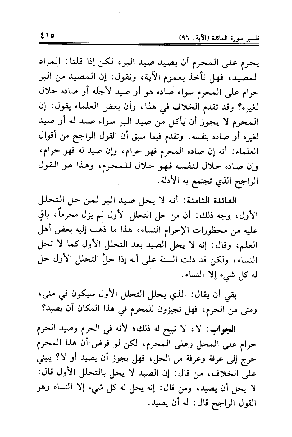 يحرم على المحرم أن يصيد صيد البر، لكن إذا قلنا: المراد المصيد، فهل نأخذ بعموم الآية، ونقول: إن المصيد من البر حرام على المحرم سواء صاده هو أو صيد لأجله أو صاده حلال لغيره؟ وقد تقدم الخلاف في هذا، وأن بعض العلماء يقول: إن المحرم لا يجوز أن يأكل من صيد البر سواء صيد له أو صيد لغيره أو صاده بنفسه، وتقدم فيما سبق أن القول الراجح من أقوال العلماء: أنه إن صاده المحرم فهو حرام، وإن صيد له فهو حرام، وإن صاده حلال لنفسه فهو حلال للمحرم، وهذا هو القول الراجح الذي تجتمع به الأدلة.