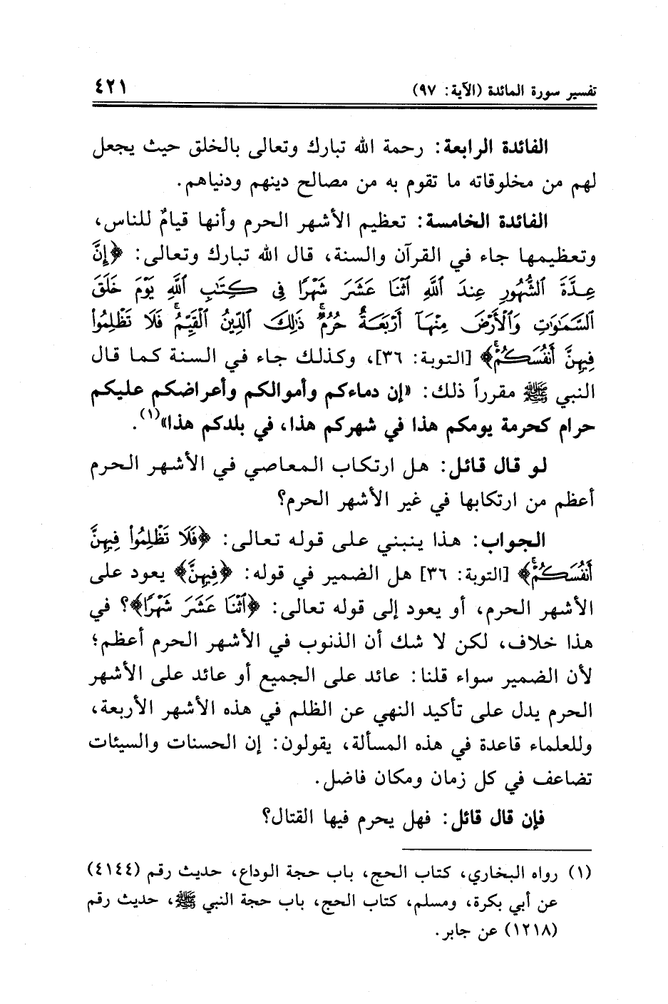 الفائدة الخامسة: تعظيم الأشهر الحرم وأنها قيامٌ للناس، وتعظيمها جاء في القرآن والسنة، قال الله تبارك وتعالى: {إِنَّ عِدَّةَ الشُّهُورِ عِنْدَ اللَّهِ اثْنَا عَشَرَ شَهْرًا فِي كِتَابِ اللَّهِ يَوْمَ خَلَقَ السَّمَاوَاتِ وَالْأَرْضَ مِنْهَا أَرْبَعَةٌ حُرُمٌ ذَلِكَ الدِّينُ الْقَيِّمُ فَلَا تَظْلِمُوا فِيهِنَّ أَنْفُسَكُمْ} [التوبة: ٣٦]، وكذلك جاء في السنة كما قال النبي - صلى الله عليه وسلم - مقررًا ذلك: "إن دماءكم وأموالكم وأعراضكم عليكم حرام كحرمة يومكم هذا في شهركم هذا، في بلدكم هذا" (¬١).