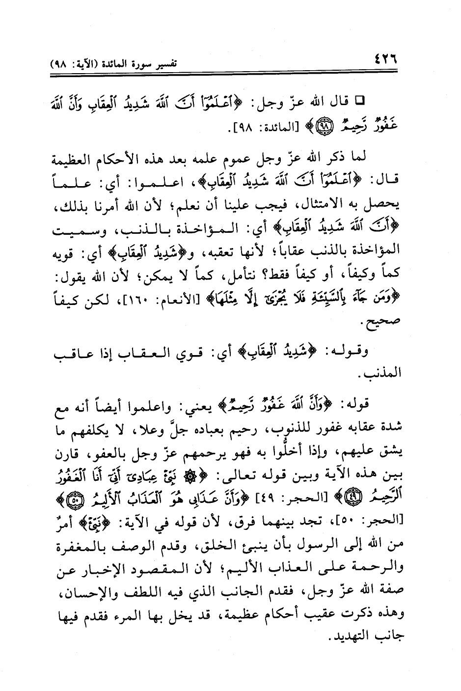 ° قال الله عزّ وجل: {عْلَمُوا أَنَّ اللَّهَ شَدِيدُ الْعِقَابِ وَأَنَّ اللَّهَ غَفُورٌ رَحِيمٌ (٩٨)} [المائدة: ٩٨].
