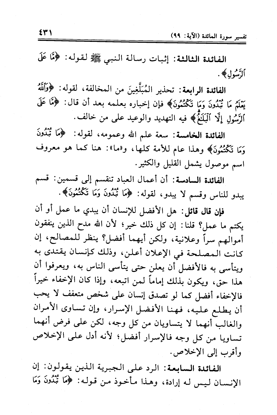 الفائدة السابعة: الرد على الجبرية الذين يقولون: إن الإنسان ليس له إرادة، وهذا مأخوذ من قوله: {مَا تُبْدُونَ وَمَا