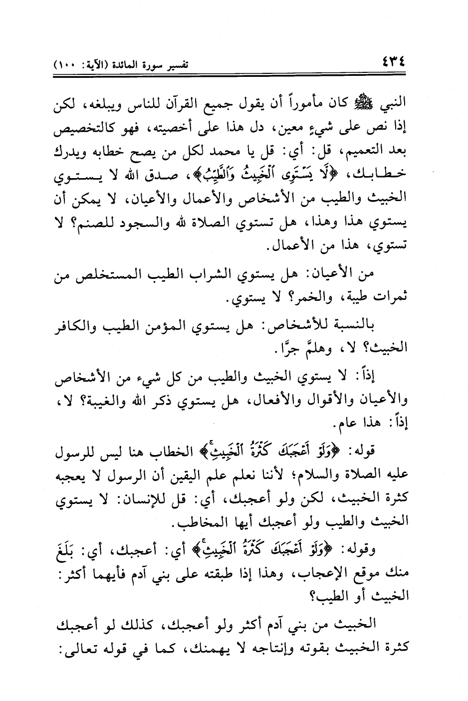 النبي - صلى الله عليه وسلم - كان مأمورًا أن يقول جميع القرآن للناس ويبلغه، لكن إذا نص على شيءٍ معين، دل هذا على أخصيته، فهو كالتخصيص بعد التعميم، قل: أي: قل يا محمَّد لكل من يصح خطابه ويدرك خطابك، {لَا يَسْتَوِي الْخَبِيثُ وَالطَّيِّبُ}، صدق الله لا يستوي الخبيث والطيب من الأشخاص والأعمال والأعيان، لا يمكن أن يستوي هذا وهذا، هل تستوي الصلاة لله والسجود للصنم؟ لا تستوي، هذا من الأعمال.
