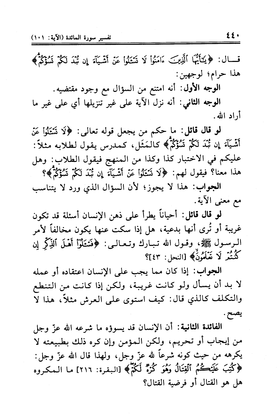 قال: {يَاأَيُّهَا الَّذِينَ آمَنُوا لَا تَسْأَلُوا عَنْ أَشْيَاءَ إِنْ تُبْدَ لَكُمْ تَسُؤْكُمْ} هذا حرام؛ لوجهين: