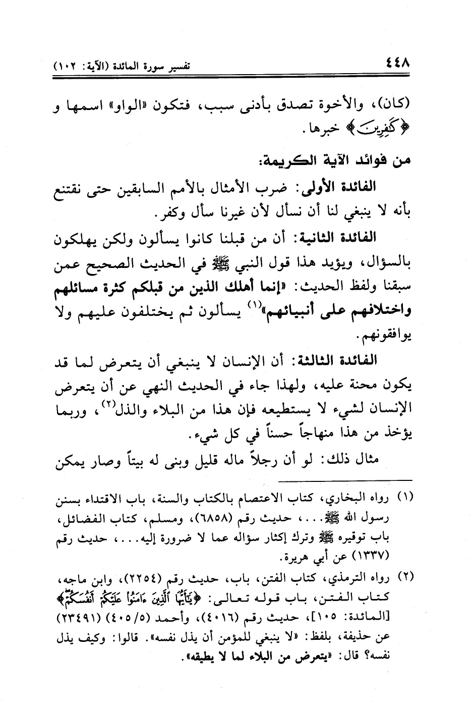 الفائدة الثالثة: أن الإنسان لا ينبغي أن يتعرض لما قد يكون محنة عليه، ولهذا جاء في الحديث النهي عن أن يتعرض الإنسان لشيء لا يستطيعه فإن هذا من البلاء والذل (¬٢)، وربما يؤخذ من هذا منهاجًا حسنًا في كل شيء.
