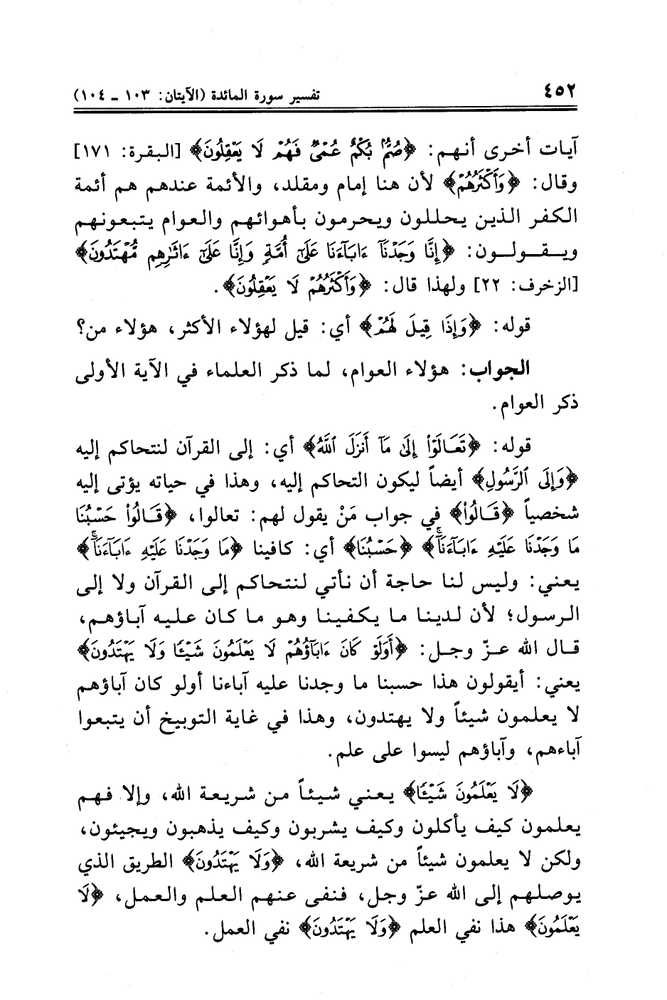 آيات أخرى أنهم: {صُمٌّ بُكْمٌ عُمْيٌ فَهُمْ لَا يَعْقِلُونَ} [البقرة: ١٧١] وقال: {وَأَكْثَرُهُمْ} لأن هنا إمام ومقلد، والأئمة عندهم هم أئمة الكفر الذين يحللون ويحرمون بأهوائهم والعوام يتبعونهم ويقولون: {إِنَّا وَجَدْنَا آبَاءَنَا عَلَى أُمَّةٍ وَإِنَّا عَلَى آثَارِهِمْ مُقْتَدُونَ} [الزخرف: ٢٢] ولهذا قال: {وَأَكْثَرُهُمْ لَا يَعْقِلُونَ}.