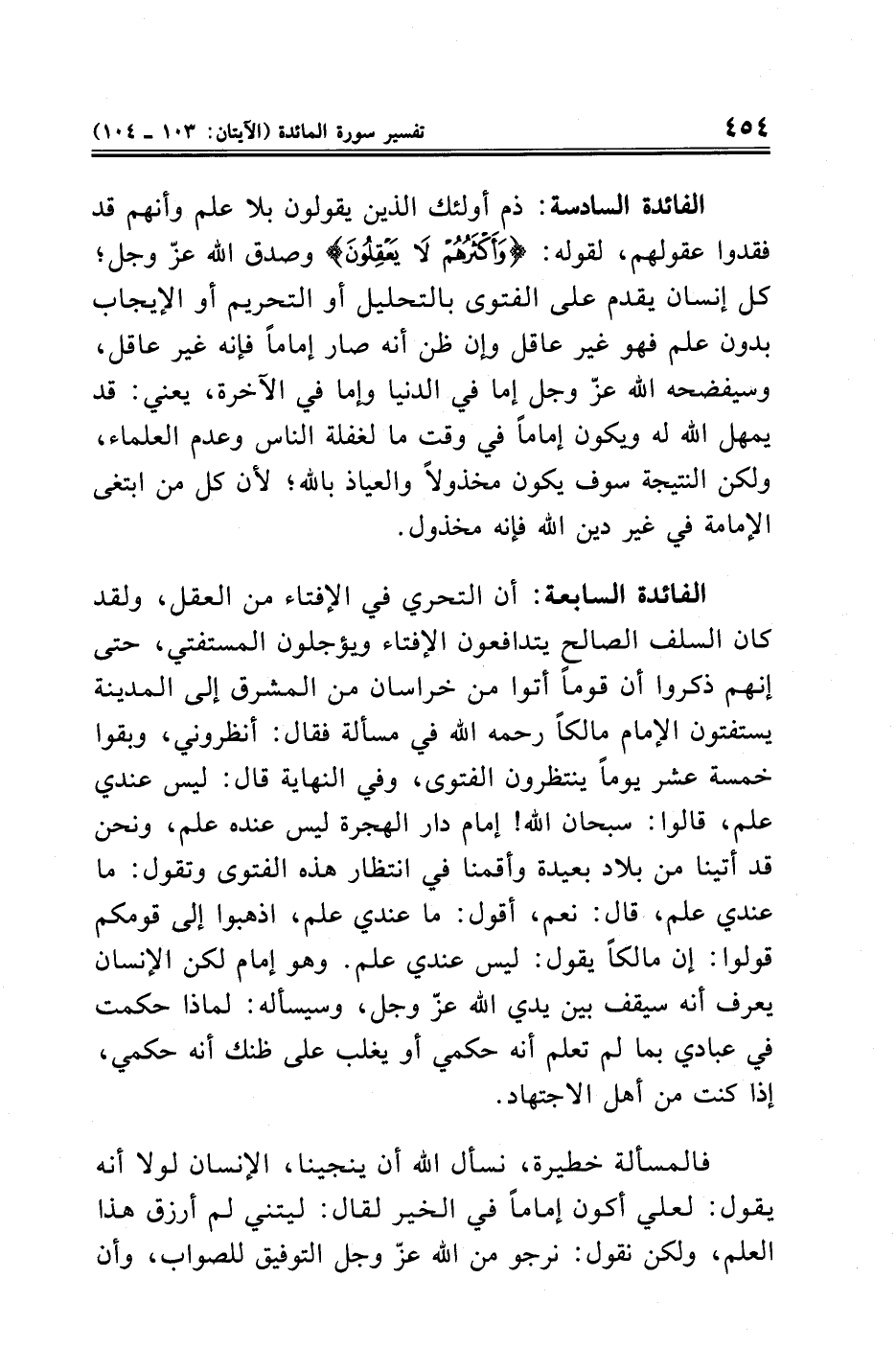 الفائدة السابعة: أن التحري في الإفتاء من العقل، ولقد كان السلف الصالح يتدافعون الإفتاء ويؤجلون المستفتي، حتى إنهم ذكروا أن قومًا أتوا من خراسان من المشرق إلى المدينة يستفتون الإِمام مالكًا رحمه الله في مسألة فقال: أنظروني، وبقوا خمسة عشر يومًا ينتظرون الفتوى، وفي النهاية قال: ليس عندي علم، قالوا: سبحان الله! إمام دار الهجرة ليس عنده علم، ونحن قد أتينا من بلاد بعيدة وأقمنا في انتظار هذه الفتوى وتقول: ما عندي علم، قال: نعم، أقول: ما عندي علم، اذهبوا إلى قومكم قولوا: إن مالكًا يقول: ليس عندي علم. وهو إمام لكن الإنسان يعرف أنه سيقف بين يدي الله عزّ وجل، وسيسأله: لماذا حكمت في عبادي بما لم تعلم أنه حكمي أو يغلب على ظنك أنه حكمي، إذا كنت من أهل الاجتهاد.