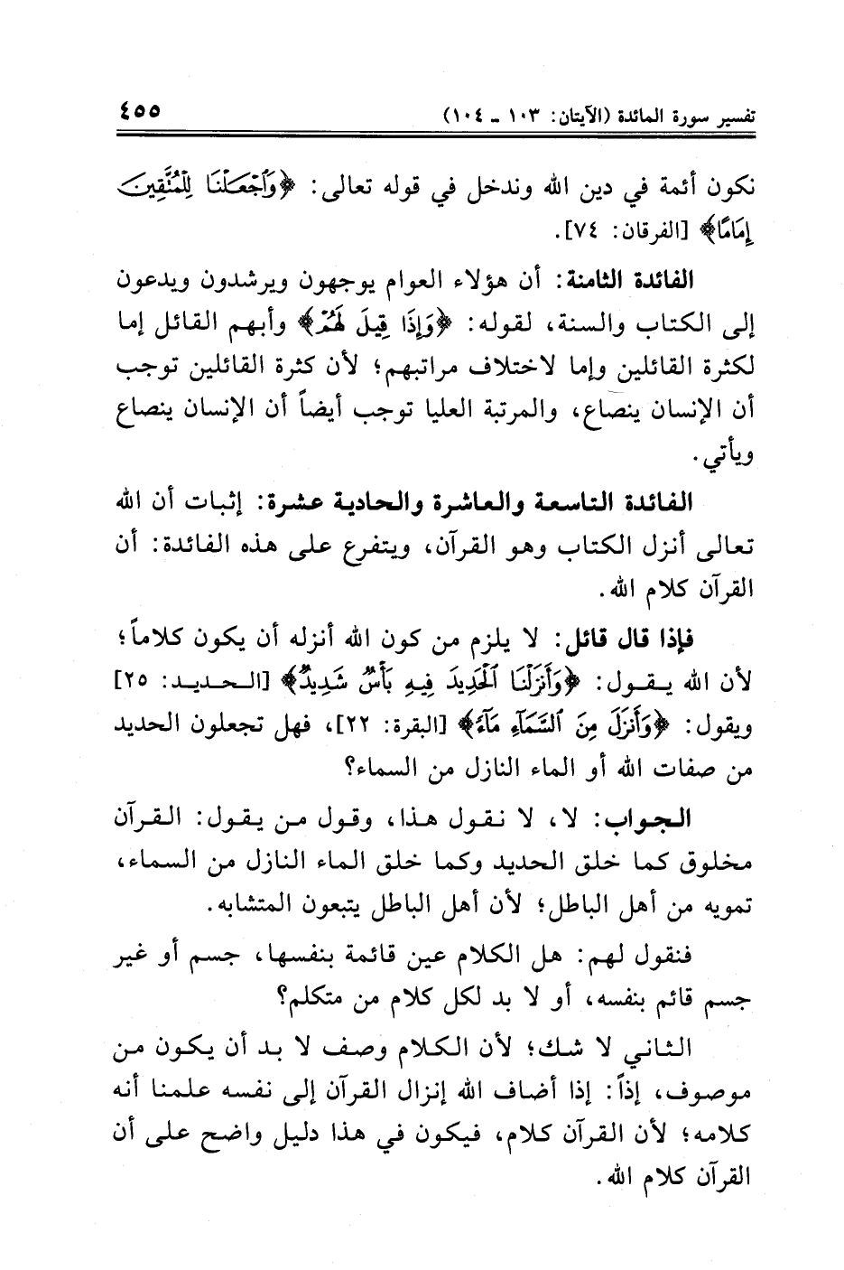 الفائدة التاسعة والعاشرة والحادية عشرة: إثبات أن الله تعالى أنزل الكتاب وهو القرآن، ويتفرع على هذه الفائدة: أن القرآن كلام الله.