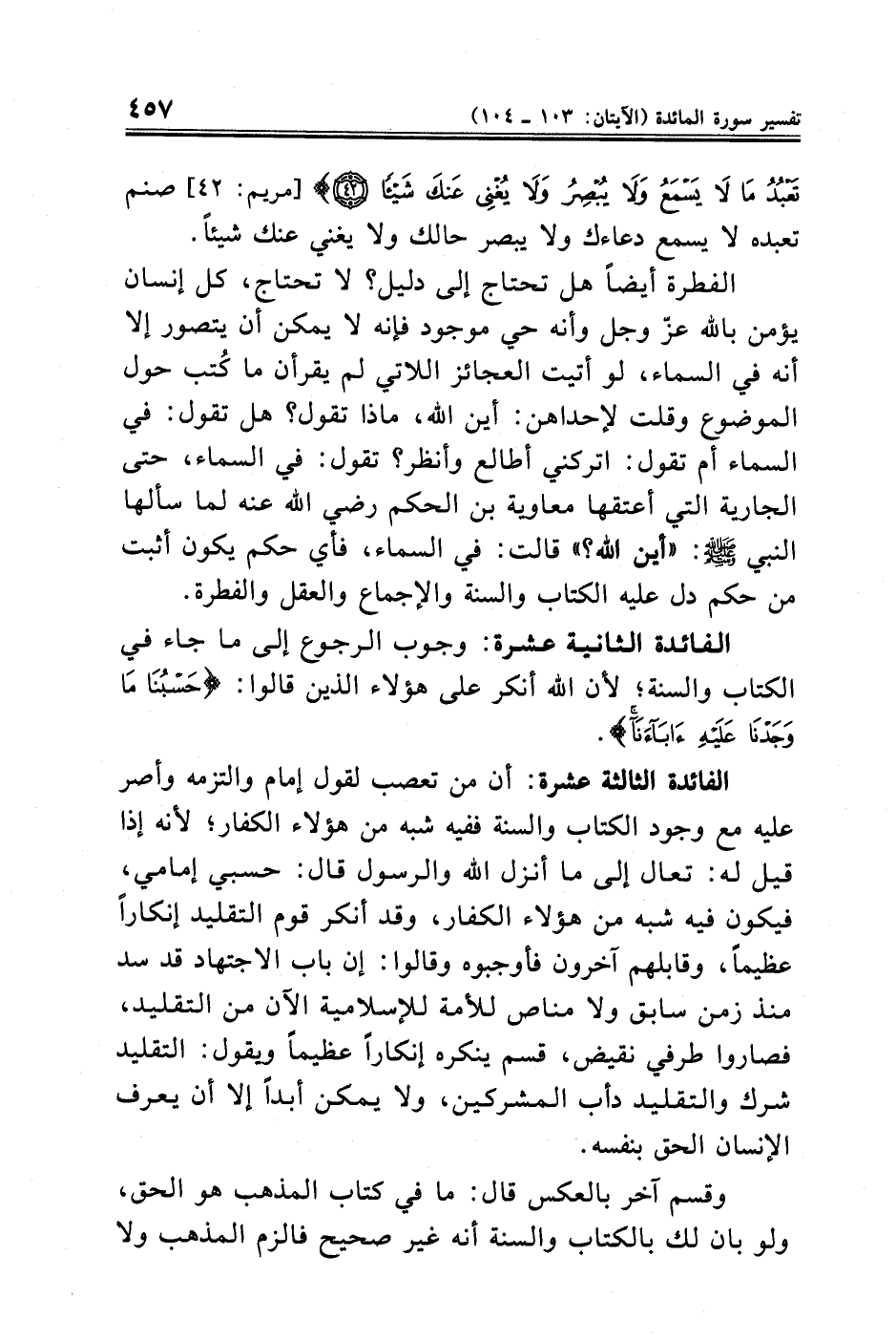 الفائدة الثالثة عشرة: أن من تعصب لقول إِمام والتزمه وأصر عليه مع وجود الكتاب والسنة ففيه شبه من هؤلاء الكفار؛ لأنه إذا قيل له: تعال إلى ما أنزل الله والرسول قال: حسبي إمامي، فيكون فيه شبه من هؤلاء الكفار، وقد أنكر قوم التقليد إنكارًا عظيمًا، وقابلهم آخرون فأوجبوه وقالوا: إِن باب الاجتهاد قد سد منذ زمن سابق ولا مناص للأمة للإسلامية الآن من التقليد، فصاروا طرفي نقيض، قسم ينكره إنكارًا عظيمًا ويقول: التقليد شرك والتقليد دأب المشركين، ولا يمكن أبدًا إلا أن يعرف الإنسان الحق بنفسه.