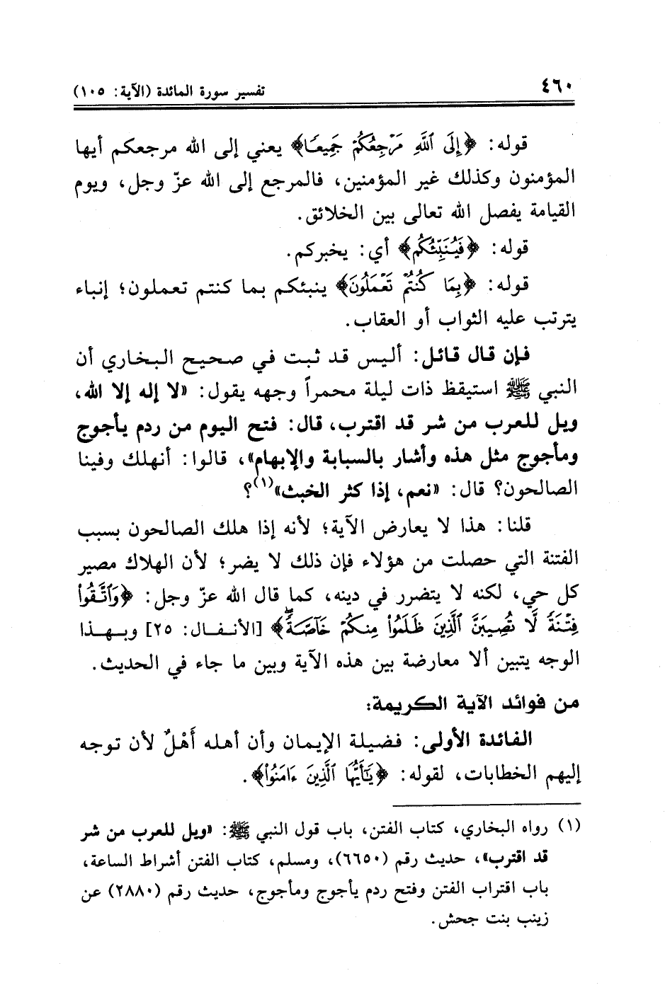 قلنا: هذا لا يعارض الآية؛ لأنه إذا هلك الصالحون بسبب الفتنة التي حصلت من هؤلاء فإن ذلك لا يضر؛ لأن الهلاك مصير كل حي، لكنه لا يتضرر في دينه، كما قال الله عزّ وجل: {وَاتَّقُوا فِتْنَةً لَا تُصِيبَنَّ الَّذِينَ ظَلَمُوا مِنْكُمْ خَاصَّةً} [الأنفال: ٢٥] وبهذا الوجه يتبين ألا معارضة بين هذه الآية وبين ما جاء في الحديث.