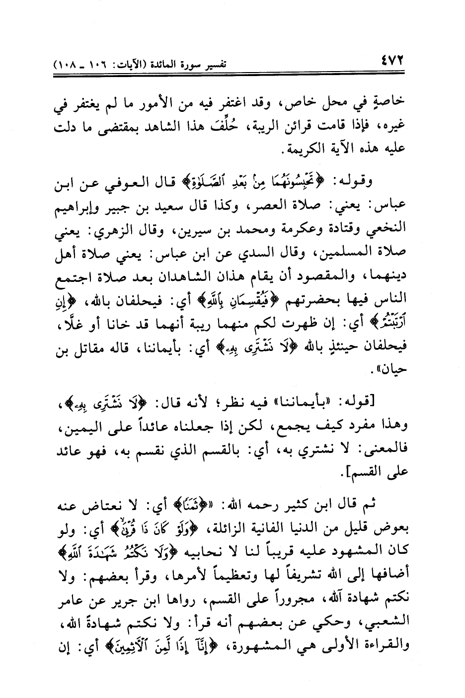 ثم قال ابن كثير رحمه الله: " {ثَمَنًا} أي: لا نعتاض عنه بعوض قليل من الدنيا الفانية الزائلة، {وَلَوْ كَانَ ذَا قُرْبَى} أي: ولو كان المشهود عليه قريبًا لنا لا نحابيه {وَلَا نَكْتُمُ شَهَادَةَ اللَّهِ} أضافها إلى الله تشريفًا لها وتعظيمًا لأمرها، وقرأ بعضهم: ولا نكتم شهادة آلله، مجرورًا على القسم، رواها ابن جرير عن عامر الشعبي، وحكي عن بعضهم أنه قرأ: ولا نكتم شهادةً الله، والقراءة الأولى هي المشهورة، {إِنَّا إِذًا لَمِنَ الْآثِمِينَ} أي: إن