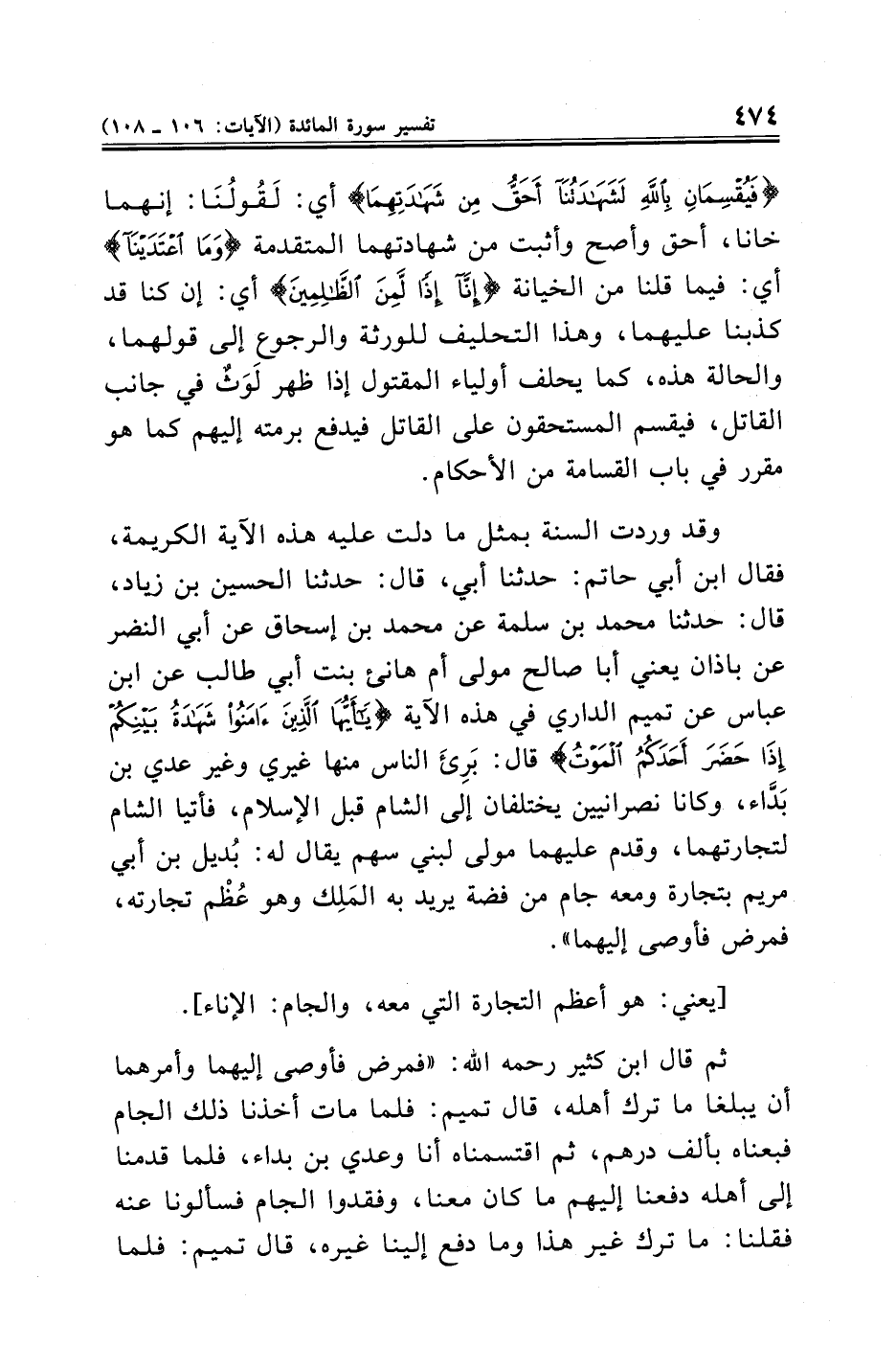 وقد وردت السنة بمثل ما دلت عليه هذه الآية الكريمة، فقال ابن أبي حاتم: حدثنا أبي، قال: حدثنا الحسين بن زياد، قال: حدثنا محمَّد بن سلمة عن محمَّد بن إسحاق عن أبي النضر عن باذان يعني أبا صالح مولى أم هانئ بنت أبي طالب عن ابن عباس عن تميم الداري في هذه الآية {يَاأَيُّهَا الَّذِينَ آمَنُوا شَهَادَةُ بَيْنِكُمْ إِذَا حَضَرَ أَحَدَكُمُ الْمَوْتُ} قال: بَرِئَ الناس منها غيري وغير عدي بن بَدَّاء، وكانا نصرانيين يختلفان إلى الشام قبل الإِسلام، فأتيا الشام لتجارتهما، وقدم عليهما مولى لبني سهم يقال له: بُديل بن أبي مريم بتجارة ومعه جام من فضة يريد به المَلِك وهو عُظْم تجارته، فمرض فأوصى إليهما".