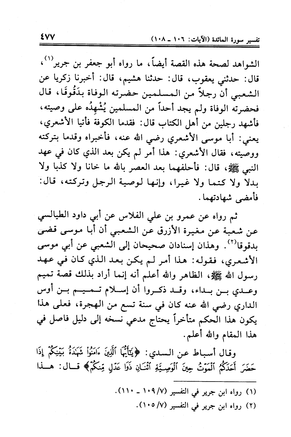 الشواهد لصحة هذه القصة أيضًا، ما رواه أبو جعفر بن جرير (¬١)، قال: حدثني يعقوب، قال: حدثنا هشيم، قال: أخبرنا زكريا عن الشعبي أن رجلًا من المسلمين حضرته الوفاة بدَقُوقَا، قال فحضرته الوفاة ولم يجد أحدًا من المسلمين يُشْهِدُه على وصيته، فأشهد رجلين من أهل الكتاب قال: فقدما الكوفة فأتيا الأشعري، يعني: أبا موسى الأشعري رضي الله عنه، فأخبراه وقدما بتركته ووصيته، فقال الأشعري: هذا أمر لم يكن بعد الذي كان في عهد النبي - صلى الله عليه وسلم -، قال: فأحلفهما بعد العصر بالله ما خانا ولا كذبا ولا بدلا ولا كتما ولا غيرا، وإنها لوصية الرجل وتركته، قال: فأمضى شهادتهما.