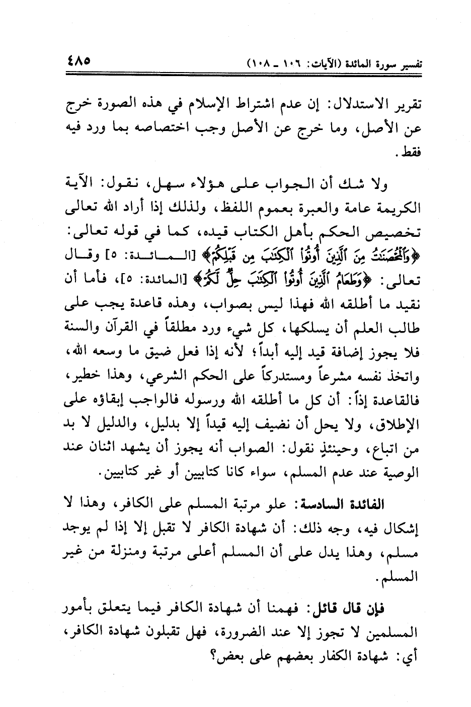 ولا شك أن الجواب على هؤلاء سهل، نقول: الآية الكريمة عامة والعبرة بعموم اللفظ، ولذلك إذا أراد الله تعالى تخصيص الحكم بأهل الكتاب قيده، كما في قوله تعالى: {وَالْمُحْصَنَاتُ مِنَ الَّذِينَ أُوتُوا الْكِتَابَ} [المائدة: ٥]، وقال تعالى: {وَطَعَامُ الَّذِينَ أُوتُوا الْكِتَابَ حِلٌّ لَكُمْ} [المائدة: ٥] , فأما أن نقيد ما أطلقه الله فهذا ليس بصواب، وهذه قاعدة يجب على طالب العلم أن يسلكها، كل شيء ورد مطلقًا في القرآن والسنة فلا يجوز إضافة قيد إليه أبدًا؛ لأنه إذا فعل ضيق ما وسعه الله، واتخذ نفسه مشرعًا ومستدركًا على الحكم الشرعي، وهذا خطير، فالقاعدة إذًا: أن كل ما أطلقه الله ورسوله فالواجب إبقاؤه على الإطلاق، ولا يحل أن نضيف إليه قيدًا إلا بدليل، والدليل لا بد من اتباع، وحينئذٍ نقول: الصواب أنه يجوز أن يشهد اثنان عند الوصية عند عدم المسلم، سواء كانا كتابيين أو غير كتابيين.