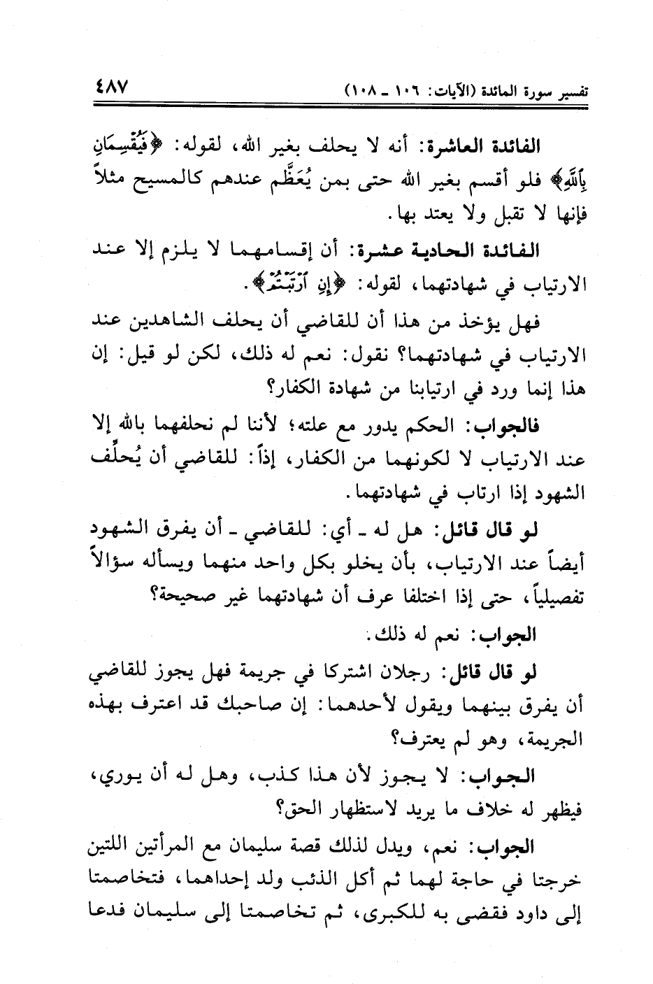 الفائدة العاشرة: أنه لا يحلف بغير الله، لقوله: {فَيُقْسِمَانِ بِاللَّهِ} فلو أقسم بغير الله حتى بمن يُعَظَّم عندهم كالمسيح مثلًا فإنها لا تقبل ولا يعتد بها.