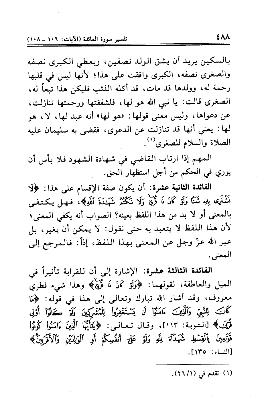 الفائدة الثالثة عشرة: الإشارة إلى أن للقرابة تأثيرًا في الميل والعاطفة، لقولهما: {وَلَوْ كَانَ ذَا قُرْبَى} وهذا شيء فطري معروف، وقد أشار الله تبارك وتعالى إلى هذا في قوله: {مَا كَانَ لِلنَّبِيِّ وَالَّذِينَ آمَنُوا أَنْ يَسْتَغْفِرُوا لِلْمُشْرِكِينَ وَلَوْ كَانُوا أُولِي قُرْبَى} [التوبة: ١١٣] , وقال تعالى: {يَاأَيُّهَا الَّذِينَ آمَنُوا كُونُوا قَوَّامِينَ بِالْقِسْطِ شُهَدَاءَ لِلَّهِ وَلَوْ عَلَى أَنْفُسِكُمْ أَوِ الْوَالِدَيْنِ وَالْأَقْرَبِينَ} [النساء: ١٣٥].