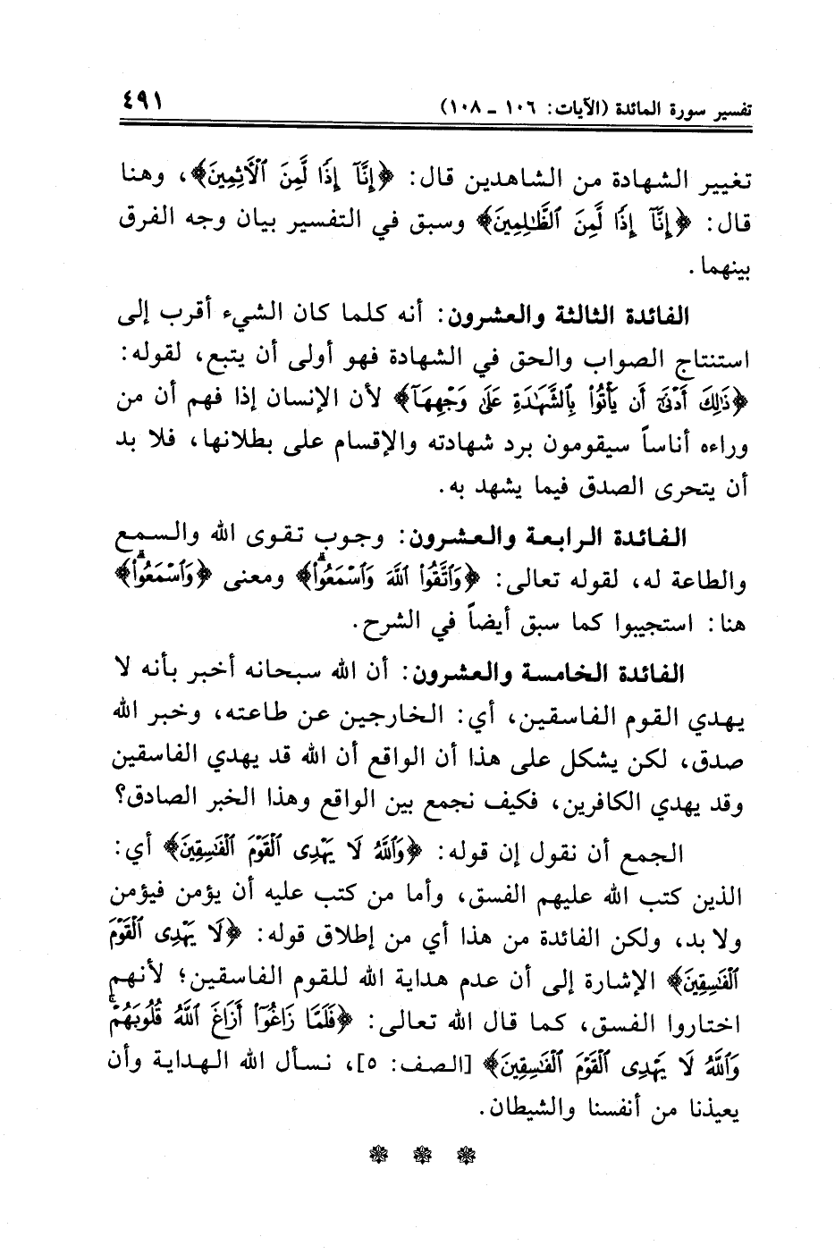 الفائدة الخامسة والعشرون: أن الله سبحانه أخبر بأنه لا يهدي القوم الفاسقين، أي: الخارجين عن طاعته، وخبر الله صدق، لكن يشكل على هذا أن الواقع أن الله قد يهدي الفاسقين وقد يهدي الكافرين، فكيف نجمع بين الواقع وهذا الخبر الصادق؟