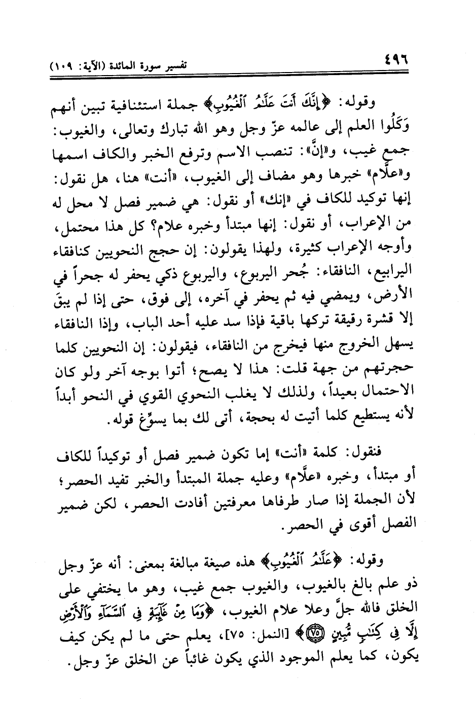 وقوله: {إِنَّكَ أَنْتَ عَلَّامُ الْغُيُوبِ} جملة استئنافية تبين أنهم وَكلُوا العلم إلى عالمه عزّ وجل وهو الله تبارك وتعالى، والغيوب: جمع غيب، و "إنَّ": تنصب الاسم وترفع الخبر والكاف اسمها و "علَّام" خبرها وهو مضاف إلى الغيوب، "أنت" هنا، هل نقول: إنها توكيد للكاف في "إنك" أو نقول: هي ضمير فصل لا محل له من الإعراب، أو نقول: إنها مبتدأ وخبره علام؟ كل هذا محتمل، وأوجه الإعراب كثيرة، ولهذا يقولون: إن حجج النحويين كنافقاء اليرابيع، النافقاء: جُحر اليربوع، واليربوع ذكي يحفر له جحرًا في الأرض، ويمضي فيه ثم يحفر في آخره، إلى فوق، حتى إذا لم يبقَ إلا قشرة رقيقة تركها باقية فإذا سد عليه أحد الباب، وإذا النافقاء يسهل الخروج منها فيخرج من النافقاء، فيقولون: إن النحويين كما حجرتهم من جهة قلت: هذا لا يصح؛ أتوا بوجه آخر ولو كان الاحتمال بعيدًا، ولذلك لا يغلب النحوي القوي في النحو أبدًا لأنه يستطيع كما أتيت له بحجة، أتى لك بما يسوِّغ قوله.
