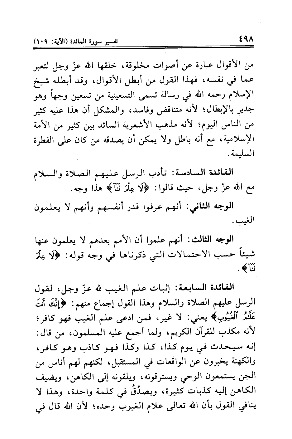 الفائدة السابعة: إثبات علم الغيب لله عزّ وجل، لقول الرسل عليهم الصلاة والسلام وهذا القول إجماع منهم: {إِنَّكَ أَنْتَ عَلَّامُ الْغُيُوبِ} يعني: لا غير، فمن ادعى علم الغيب فهو كافر؛ لأنه مكذب للقرآن الكريم، ولما أجمع عليه المسلمون، من قال: إنه سيحدث في يوم كذا، كذا وكذا فهو كاذب وهو كافر، والكهنة يخبرون عن الواقعات في المستقبل، لكنهم لهم أناس من الجن يستمعون الوحي ويسترقونه، ويلقونه إلى الكاهن، ويضيف الكاهن إليه كذبات كثيرة، ويصدُقُ في كلمة واحدة، وهذا لا