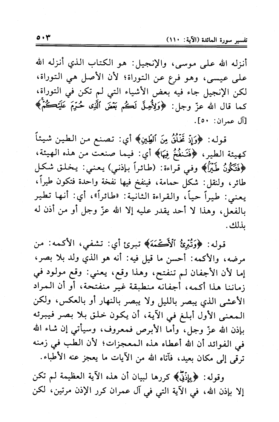 قوله: {وَتُبْرِئُ الْأَكْمَهَ} تبرئ أي: تشفي، الأكمه: من مرضه، والأكمه: أحسن ما قيل فيه: أنه هو الذي ولد بلا بصر، إما لأن الأجفان لم تنفتح، وهذا وقع، يعني: وقع مولود في زماننا هذا أكمه، أجفانه منطبقة غير منفتحة، أو أن المراد الأعشى الذي يبصر بالليل ولا يبصر بالنهار أو بالعكس، ولكن المعنى الأول أبلغ في الآية، أن يكون خلق بلا بصر فيبرئه بإذن الله عزّ وجل، وأما الأبرص فمعروف، وسيأتي إن شاء الله في الفوائد أن الله أعطاه هذه المعجزات؛ لأن الطب في زمنه ترقى إلى مكان بعيد، فآتاه الله من الآيات ما يعجز عنه الأطباء.