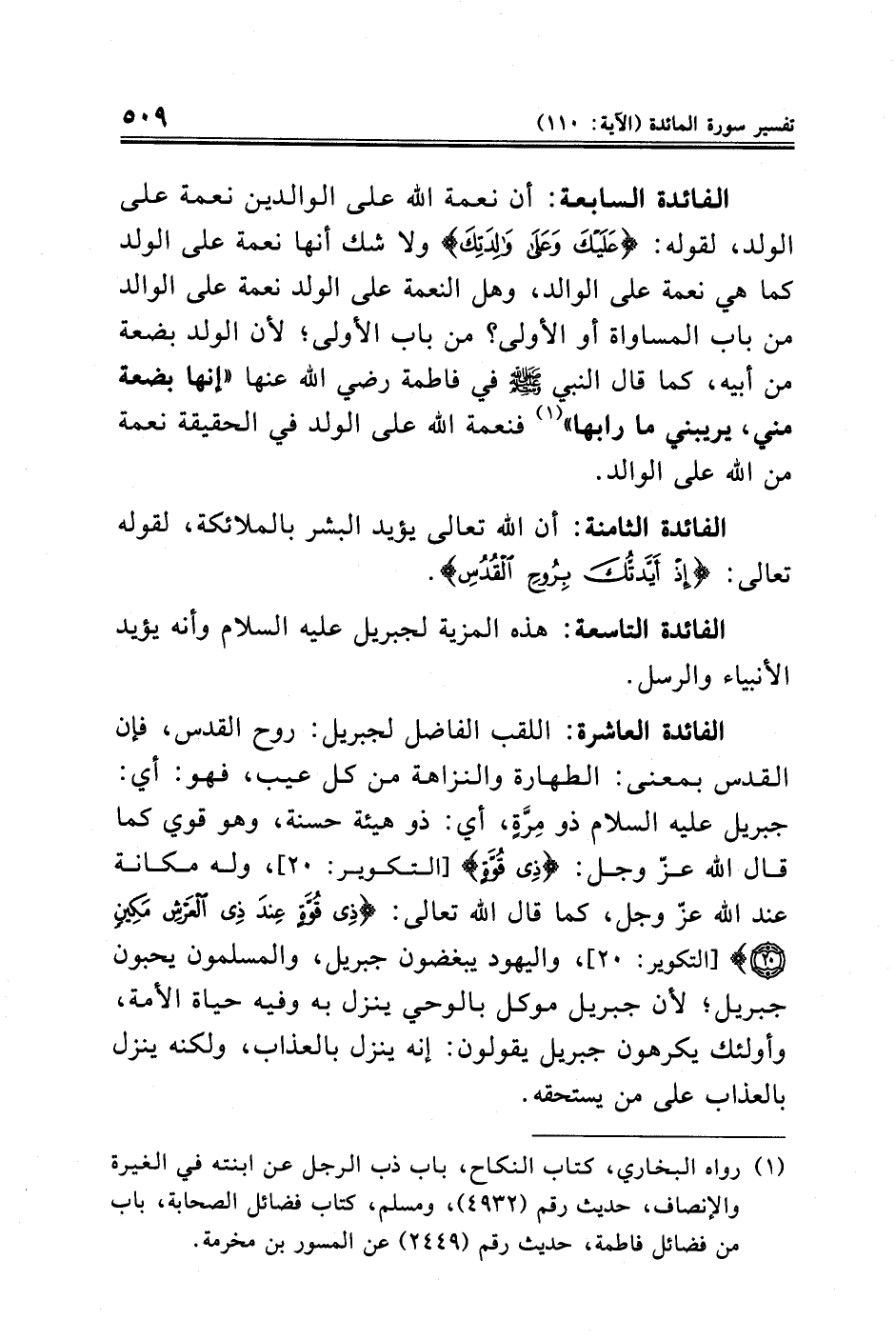 الفائدة الثامنة: أن الله تعالى يؤيد البشر بالملائكة، لقوله تعالى: {إِذْ أَيَّدْتُكَ بِرُوحِ الْقُدُسِ}.