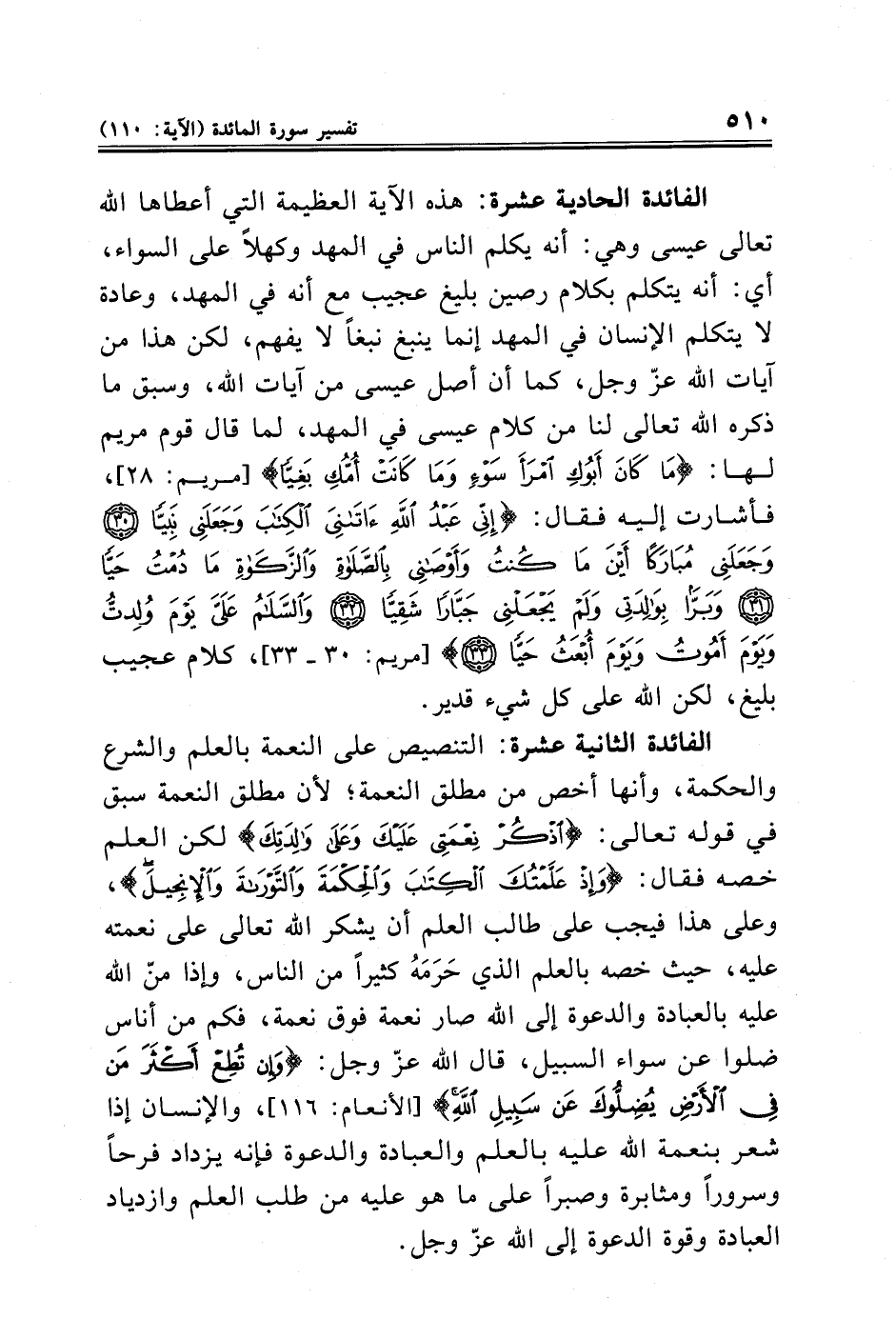 الفائدة الثانية عشرة: التنصيص على النعمة بالعلم والشرع والحكمة، وأنها أخص من مطلق النعمة؛ لأن مطلق النعمة سبق في قوله تعالى: {اذْكُرْ نِعْمَتِي عَلَيْكَ وَعَلَى وَالِدَتِكَ} لكن العلم خصه فقال: {وَإِذْ عَلَّمْتُكَ الْكِتَابَ وَالْحِكْمَةَ وَالتَّوْرَاةَ وَالْإِنْجِيلَ}، وعلى هذا فيجب على طالب العلم أن يشكر الله تعالى على نعمته عليه، حيث خصه بالعلم الذي حَرَمَهُ كثيرًا من الناس، وإذا من الله عليه بالعبادة والدعوة إلى الله صار نعمة فوق نعمة، فكم من أناس ضلوا عن سواء السبيل، قال الله عزّ وجل: {وَإِنْ تُطِعْ أَكْثَرَ مَنْ فِي الْأَرْضِ يُضِلُّوكَ عَنْ سَبِيلِ اللَّهِ} [الأنعام: ١١٦]، والإنسان إذا شعر بنعمة الله عليه بالعلم والعبادة والدعوة فإنه يزداد فرحًا وسرورًا ومثابرة وصبرًا على ما هو عليه من طلب العلم وازدياد العبادة وقوة الدعوة إلى الله عزّ وجل.