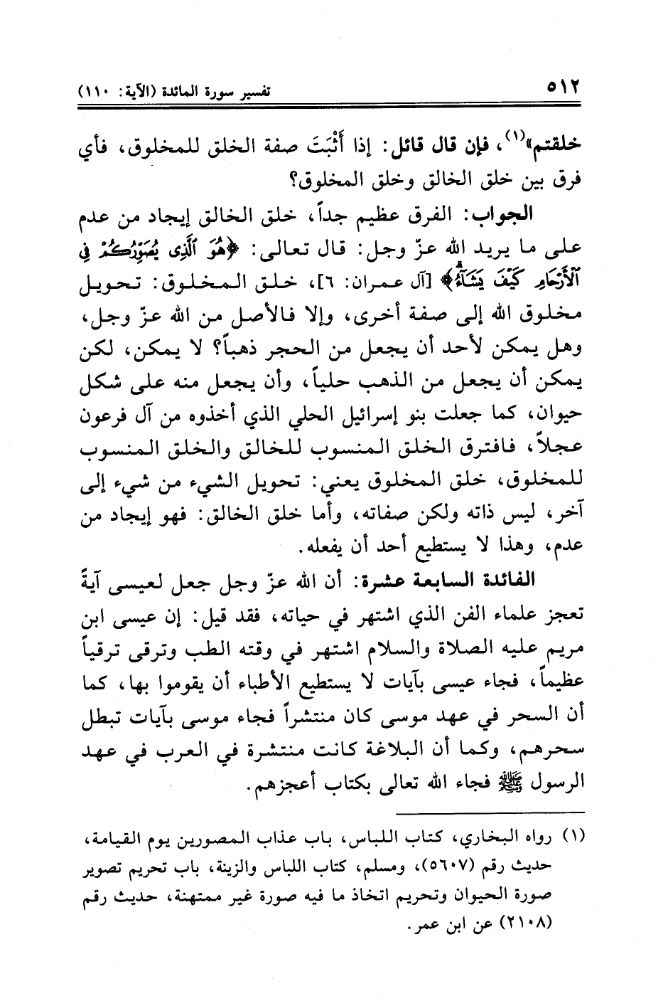 (¬١) رواه البخاري، كتاب اللباس، باب عذاب المصورين يوم القيامة، حديث رقم (٥٦٠٧)، ومسلم، كتاب اللباس والزينة، باب تحريم تصوير صورة الحيوان وتحريم اتخاذ ما فيه صورة غير ممتهنة، حديث رقم (٢١٠٨) عن ابن عمر.