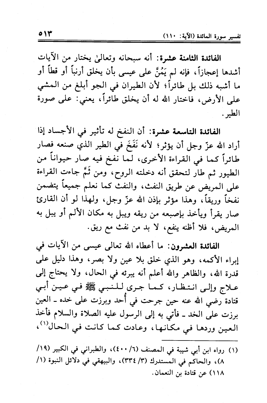 الفائدة العشرون: ما أعطاه الله تعالى عيسى من الآيات في إبراء الأكمه، وهو الذي خلق بلا عين ولا بصر، وهذا دليل على قدرة الله، والظاهر والله أعلم أنه يبرئه في الحال، ولا يحتاج إلى علاج وإلى انتظار، كما جرى للنبي - صلى الله عليه وسلم - في عين أبي قتادة رضي الله عنه حين جرحت في أُحد وبرزت على خده -العين برزت على الخد- فأتي به إلى الرسول عليه الصلاة والسلام فأخذ العين وردها في مكانها، وعادت كما كانت في الحال (¬١)،