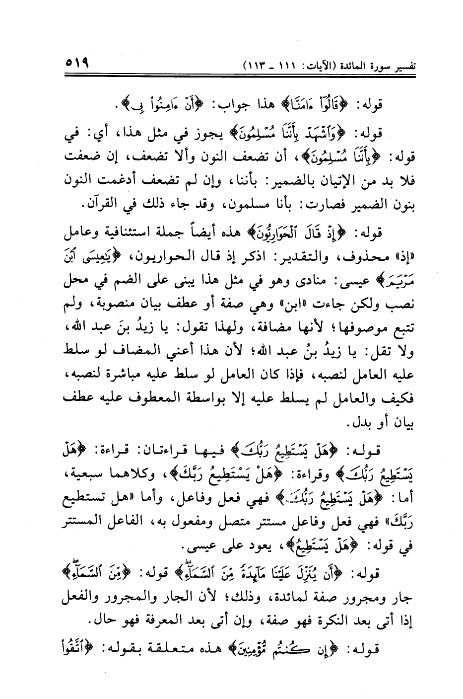 قوله: {إِذْ قَالَ الْحَوَارِيُّونَ} هذه أيضًا جملة استئنافية وعامل "إذ" محذوف، والتقدير: اذكر إذ قال الحواريون، {يَاعِيسَى ابْنَ مَرْيَمَ} عيسى: منادى وهو في مثل هذا يبنى على الضم في محل نصب ولكن جاءت "ابن" وهي صفة أو عطف بيان منصوبة، ولم تتبع موصوفها؛ لأنها مضافة، ولهذا تقول: يا زيدُ بنَ عبد الله، ولا تقل: يا زيدُ بنُ عبد الله؛ لأن هذا أعني المضاف لو سلط عليه العامل لنصبه، فإذا كان العامل لو سلط عليه مباشرة لنصبه، فكيف والعامل لم يسلط عليه إلا بواسطة المعطوف عليه عطف بيان أو بدل.