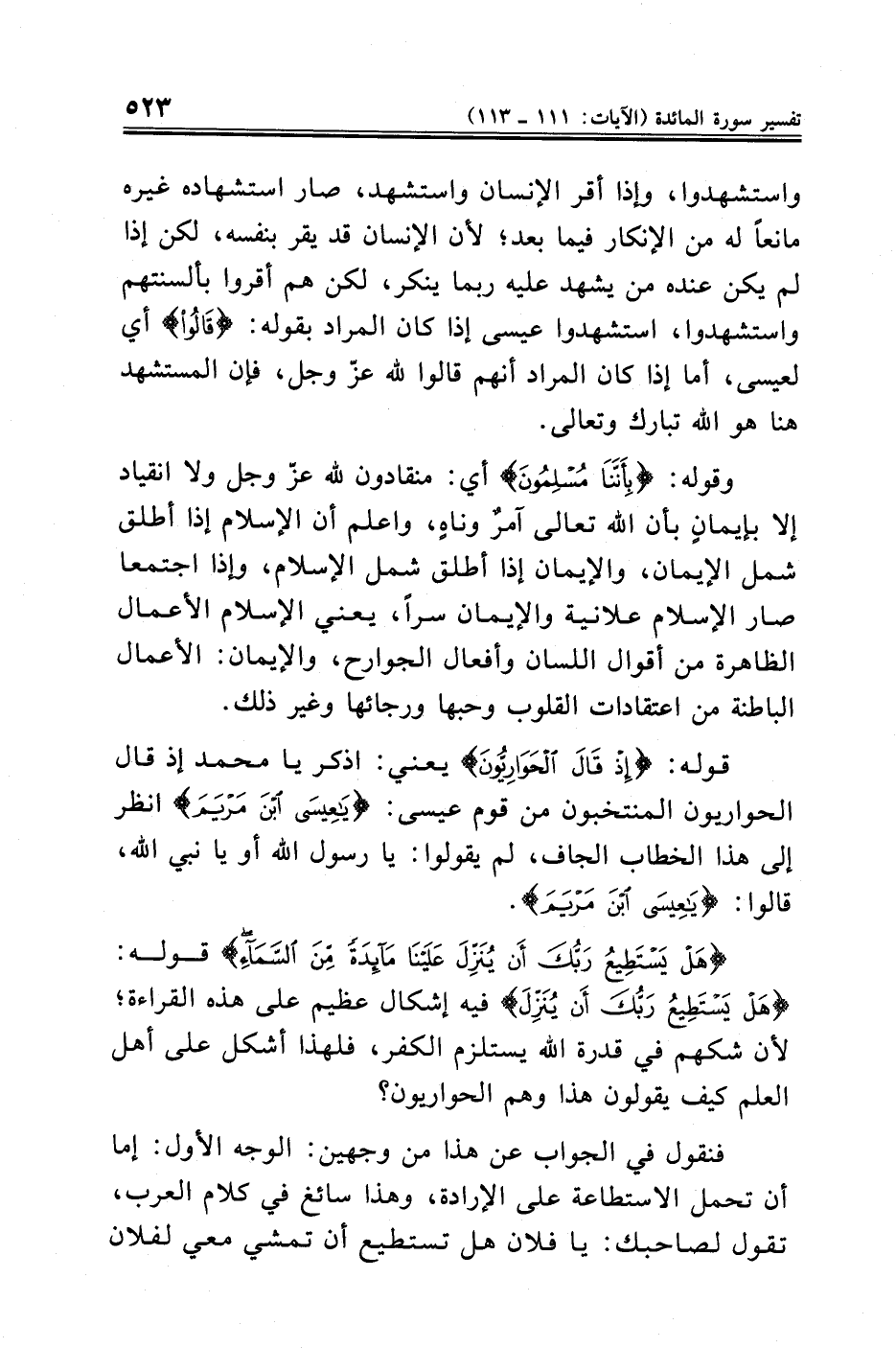 {هَلْ يَسْتَطِيعُ رَبُّكَ أَنْ يُنَزِّلَ عَلَيْنَا مَائِدَةً مِنَ السَّمَاءِ} قوله: {هَلْ يَسْتَطِيعُ رَبُّكَ أَنْ يُنَزِّلَ} فيه إشكال عظيم على هذه القراءة؛ لأن شكهم في قدرة الله يستلزم الكفر، فلهذا أشكل على أهل العلم كيف يقولون هذا وهم الحواريون؟