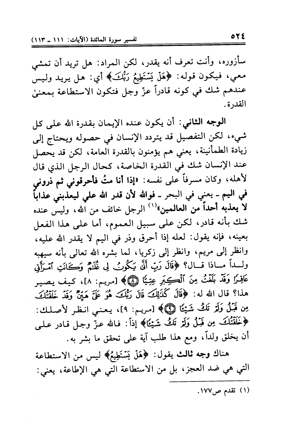 سأزوره، وأنت تعرف أنه يقدر، لكن المراد: هل تريد أن تمشي معي، فيكون قوله: {هَلْ يَسْتَطِيعُ رَبُّكَ} أي: هل يريد وليس عندهم شك في كونه قادرًا عز وجل فتكون الاستطاعة بمعنى القدرة. الوجه الثاني: أن يكون عنده الإيمان بقدرة الله على كل شيء، لكن التفصيل قد يتردد الإنسان في حصوله ويحتاج إلى زيادة الطمأنينة، يعني هم يؤمنون بالقدرة العامة، لكن قد يحصل عند الإنسان شك في القدرة الخاصة، كحال الرجل الذي قال لأهله، وكان مسرفًا على نفسه: "إذا أنا متُ فأحرقوني ثم ذروني في اليم -يعني في البحر- فوالله لأن قدر الله علي ليعذبني عذابًا لا يعذبه أحدًا من العالمين" (¬١) الرجل خائف من الله، وليس عنده شك بأنه قادر، لكن على سبيل العموم، أما على هذا الفعل بعينه، فإنه يقول: لعله إذا أحرق وذر في اليم لا يقدر النه عليه، وانظر إلى مريم، وانظر إلى زكريا، لما بشره الله تعالى بأنه سيهبه ولدًا ماذا قال؟ {قَالَ رَبِّ أَنَّى يَكُونُ لِي غُلَامٌ وَكَانَتِ امْرَأَتِي عَاقِرًا وَقَدْ بَلَغْتُ مِنَ الْكِبَرِ عِتِيًّا (٨)} [مريم: ٨]، كيف يصير هذا؟ قال الله له: {قَالَ كَذَلِكَ قَالَ رَبُّكَ هُوَ عَلَيَّ هَيِّنٌ وَقَدْ خَلَقْتُكَ مِنْ قَبْلُ وَلَمْ تَكُ شَيْئًا (٩)} [مريم: ٩]، يعني انظر لأصلك: {خَلَقْتُكَ مِنْ قَبْلُ وَلَمْ تَكُ شَيْئًا} إذًا: فالله عزّ وجل قادر على أن يخلق ولدًا، ومع هذا طلب آية على تحقق ما بشر به.