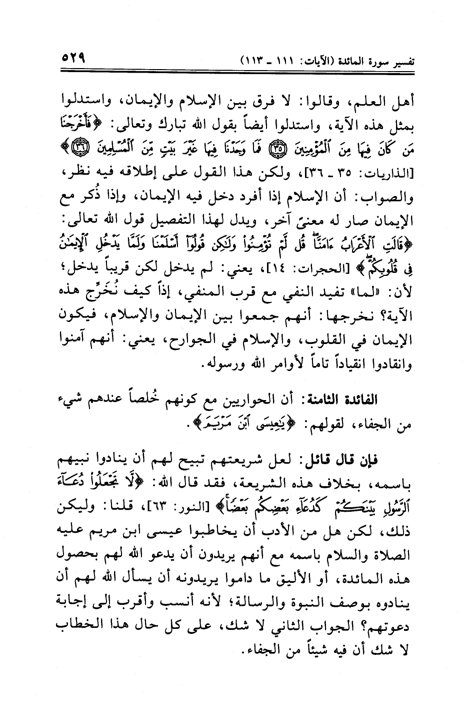 أهل العلم، وقالوا: لا فرق بين الإسلام والإيمان، واستدلوا بمثل هذه الآية، واستدلوا أيضًا بقول الله تبارك وتعالى: {فَأَخْرَجْنَا مَنْ كَانَ فِيهَا مِنَ الْمُؤْمِنِينَ (٣٥) فَمَا وَجَدْنَا فِيهَا غَيْرَ بَيْتٍ مِنَ الْمُسْلِمِينَ} [الذاريات: ٣٥ - ٣٦]، ولكن هذا القول على إطلاقه فيه نظر، والصواب: أن الإسلام إذا أفرد دخل فيه الإيمان، وإذا ذُكر مع الإيمان صار له معنىً آخر، ويدل لهذا التفصيل قول الله تعالى: {قَالَتِ الْأَعْرَابُ آمَنَّا قُلْ لَمْ تُؤْمِنُوا وَلَكِنْ قُولُوا أَسْلَمْنَا وَلَمَّا يَدْخُلِ الْإِيمَانُ فِي قُلُوبِكُمْ} [الحجرات: ١٤]، يعني: لم يدخل لكن قريبًا يدخل؛ لأن: "لما" تفيد النفي مع قرب المنفي، إذًا كيف نُخَرِّج هذه الآية؟ نخرجها: أنهم جمعوا بين الإيمان والإسلام، فيكون الإيمان في القلوب، والإسلام في الجوارح، يعني: أنهم آمنوا وانقادوا انقيادًا تامًّا لأوامر الله ورسوله.
