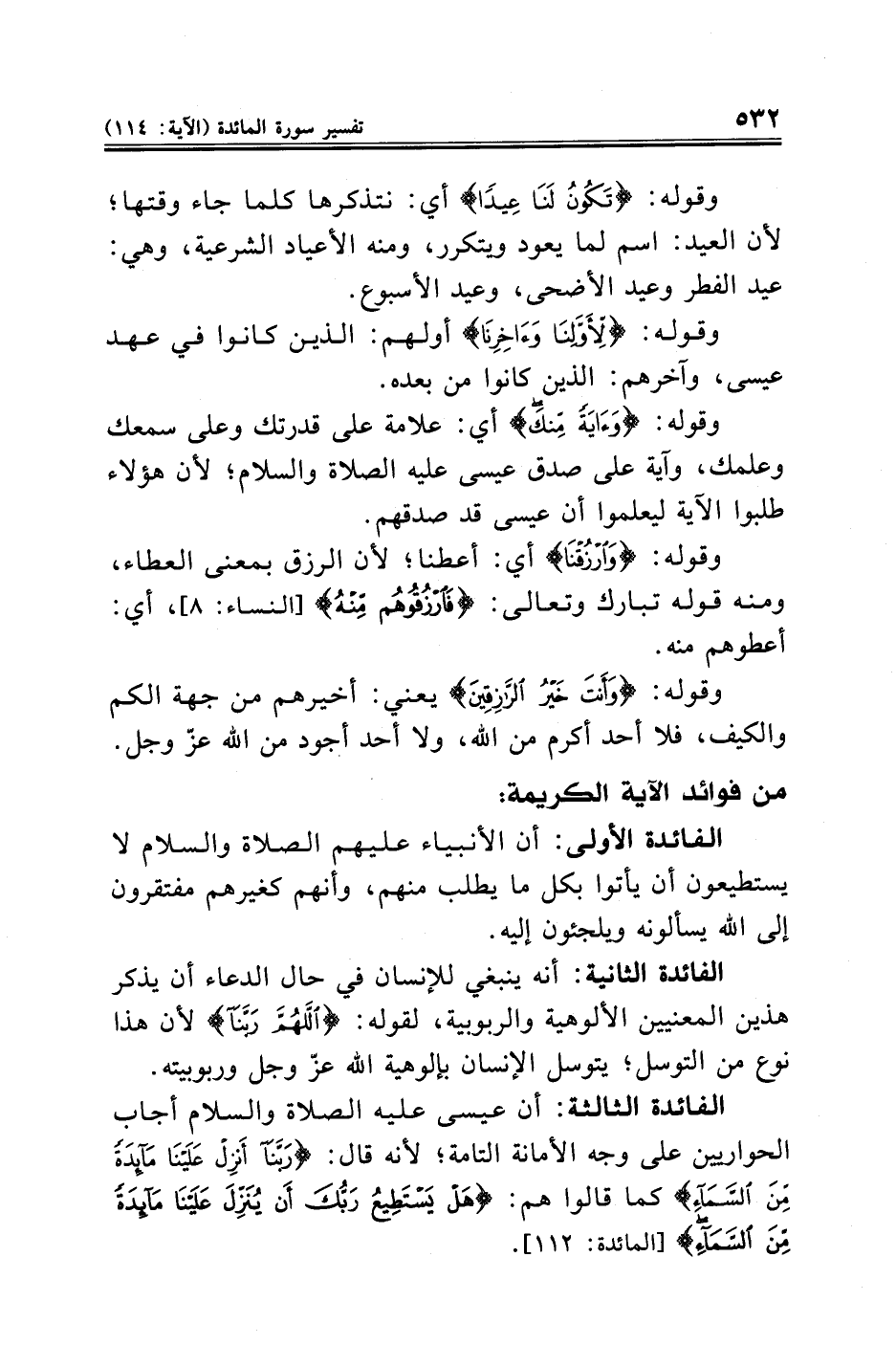 الفائدة الثالثة: أن عيسى عليه الصلاة والسلام أجاب الحواريين على وجه الأمانة التامة؛ لأنه قال: {رَبَّنَا أَنْزِلْ عَلَيْنَا مَائِدَةً مِنَ السَّمَاءِ} كما قالوا هم: {هَلْ يَسْتَطِيعُ رَبُّكَ أَنْ يُنَزِّلَ عَلَيْنَا مَائِدَةً مِنَ السَّمَاءِ} [المائدة: ١١٢].