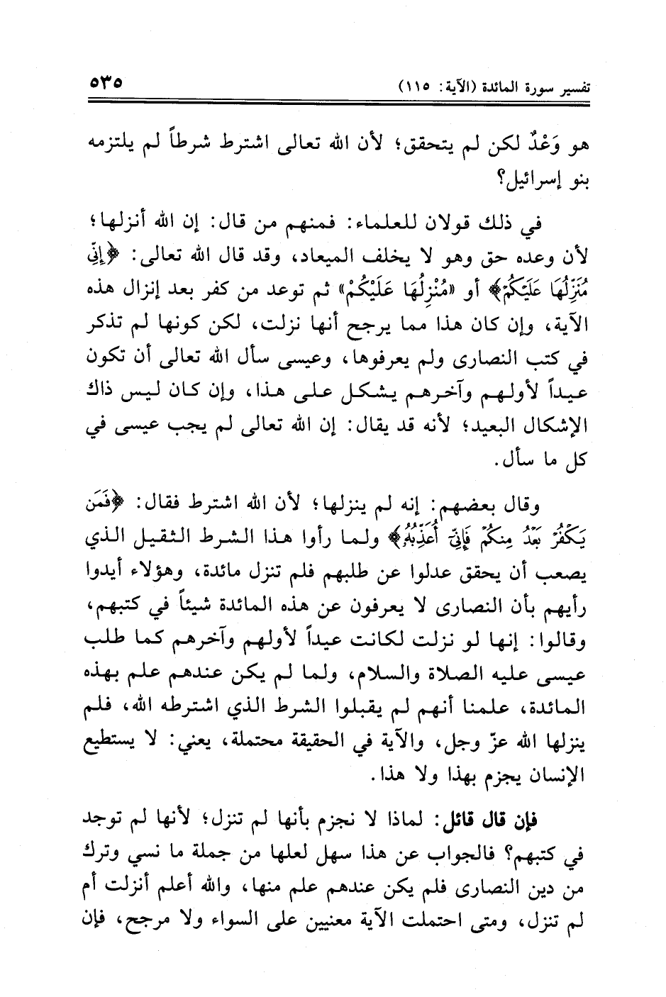 وقال بعضهم: إنه لم ينزلها؛ لأن الله اشترط فقال: {فَمَنْ يَكْفُرْ بَعْدُ مِنْكُمْ فَإِنِّي أُعَذِّبُهُ} ولما رأوا هذا الشرط الثقيل الذي يصعب أن يحقق عدلوا عن طلبهم فلم تنزل مائدة، وهؤلاء أيدوا رأيهم بأن النصارى لا يعرفون عن هذه المائدة شيئًا في كتبهم، وقالوا: إنها لو نزلت لكانت عيدًا لأولهم وآخرهم كما طلب عيسى عليه الصلاة والسلام، ولما لم يكن عندهم علم بهذه المائدة، علمنا أنهم لم يقبلوا الشرط الذي اشترطه الله، فلم ينزلها الله عزّ وجل، والآية في الحقيقة محتملة، يعني: لا يستطيع الإنسان يجزم بهذا ولا هذا.