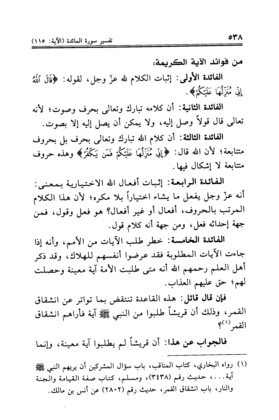 الفائدة الثالثة: أن كلام الله تبارك وتعالى بحرف بل بحروف متتابعة؛ لأن الله قال: {إِنِّي مُنَزِّلُهَا عَلَيْكُمْ فَمَنْ يَكْفُرْ} وهذه حروف متتابعة لا إشكال فيها.