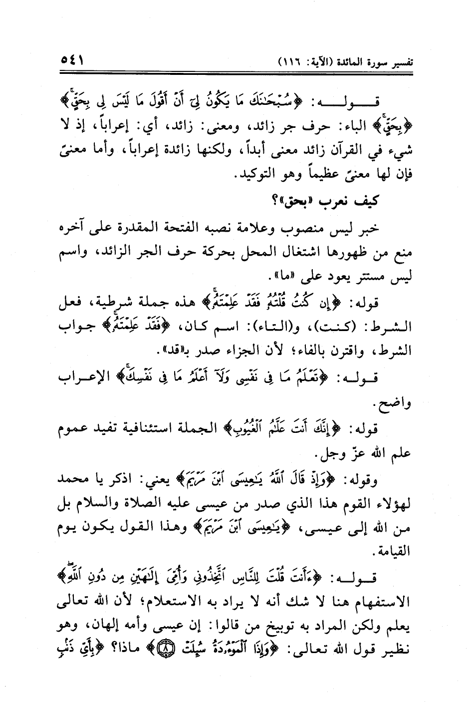 قوله: {سُبْحَانَكَ مَا يَكُونُ لِي أَنْ أَقُولَ مَا لَيْسَ لِي بِحَقٍّ} {بِحَقٍّ} الباء: حرف جر زائد، ومعنى: زائد، أي: إعرابًا، إذ لا شيء في القرآن زائد معنى أبدًا، ولكنها زائدة إعرابًا، وأما معنىً فإن لها معنىً عظيمًا وهو التوكيد.