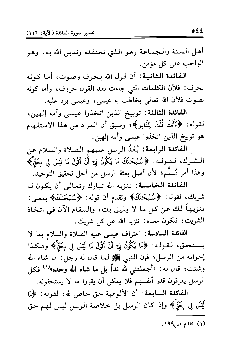 الفائدة السادسة: اعتراف عيسى عليه الصلاة والسلام بما لا يستحق، لقوله: {مَا يَكُونُ لِي أَنْ أَقُولَ مَا لَيْسَ لِي بِحَقٍّ} وهكذا إخوانه من الرسل؛ فإن النبي - صلى الله عليه وسلم - لما قال له رجل: ما شاء الله وشئت؛ قال له: "أجعلتني لله ندًّا بل ما شاء الله وحده" (¬١) فكل الرسل يعرفون قدر أنفسهم فلا يمكن أن يقروا ما لا يستحقونه.