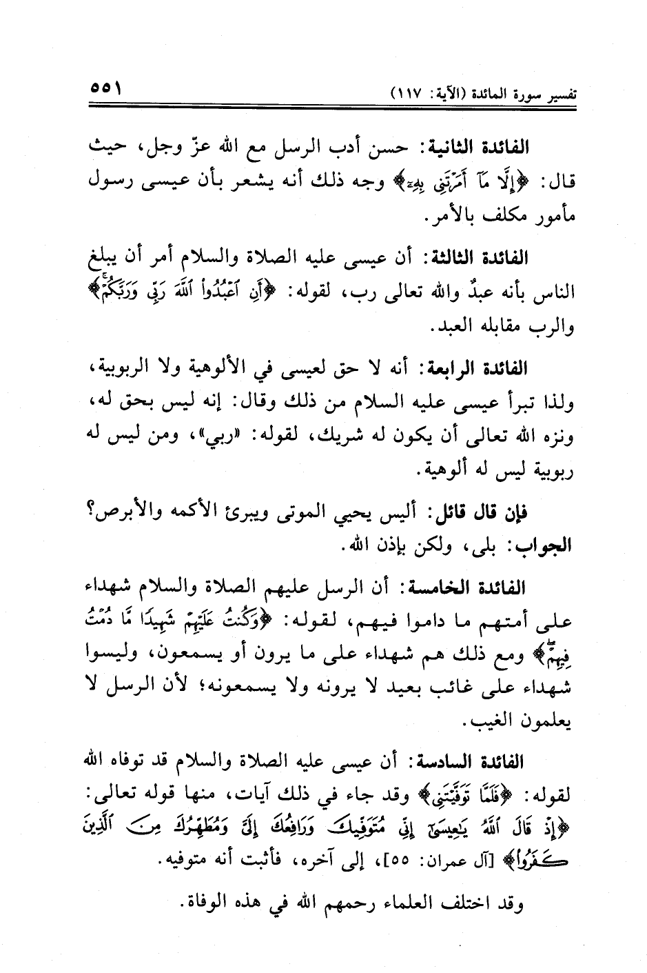 الفائدة السادسة: أن عيسى عليه الصلاة والسلام قد توفاه الله لقوله: {فَلَمَّا تَوَفَّيْتَنِي} وقد جاء في ذلك آيات، منها قوله تعالى: {إِذْ قَالَ اللَّهُ يَاعِيسَى إِنِّي مُتَوَفِّيكَ وَرَافِعُكَ إِلَيَّ وَمُطَهِّرُكَ مِنَ الَّذِينَ كَفَرُوا} [آل عمران: ٥٥]، إلى آخره، فأثبت أنه متوفيه.