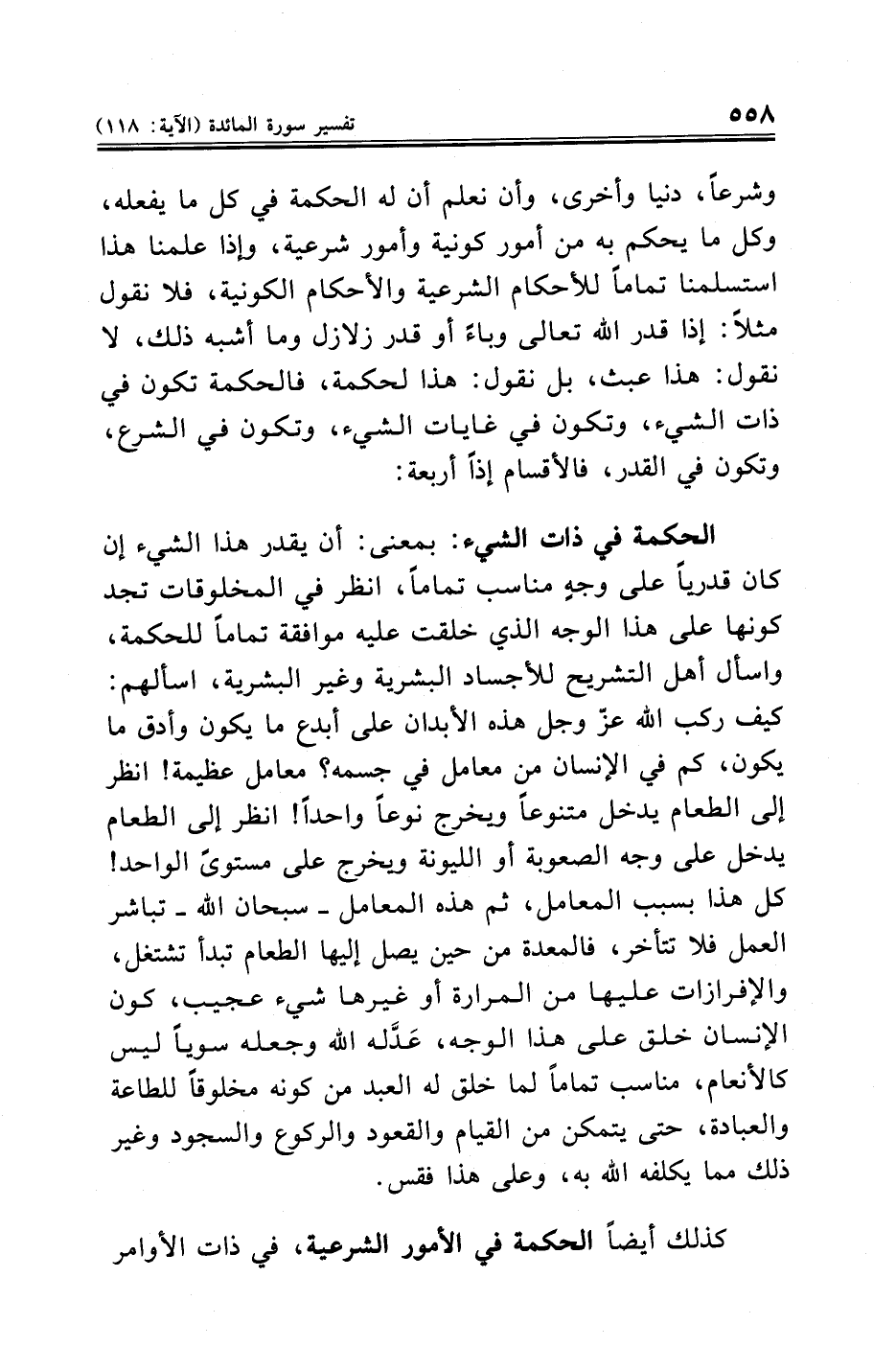 الحكمة في ذات الشيء: بمعنى: أن يقدر هذا الشيء إن كان قدريًّا على وجهٍ مناسب تمامًا، انظر في المخلوقات تجد كونها على هذا الوجه الذي خلقت عليه موافقة تمامًا للحكمة، واسأل أهل التشريح للأجساد البشرية وغير البشرية، اسألهم: كيف ركب الله عزّ وجل هذه الأبدان على أباع ما يكون وأدق ما يكون، كم في الإنسان من معامل في جسمه؟ معامل عظيمة! انظر إلى الطعام يدخل متنوعًا ويخرج نوعًا واحدًا! انظر إلى الطعام يدخل على وجه الصعوبة أو الليونة ويخرج على مستوىً الواحد! كل هذا بسبب المعامل، ثم هذه المعامل -سبحان الله- تباشر العمل فلا تتأخر، فالمعدة من حين يصل إليها الطعام تبدأ تشتغل، والإفرازات عليها من المرارة أو غيرها شيء عجيب، كون الإنسان خلق على هذا الوجه، عَدَّله الله وجعله سويًّا ليس كالأنعام، مناسب تمامًا لما خلق له العبد من كونه مخلوقًا للطاعة والعبادة، حتى يتمكن من القيام والقعود والركوع والسجود وغير ذلك مما يكلفه الله به، وعلى هذا فقس.