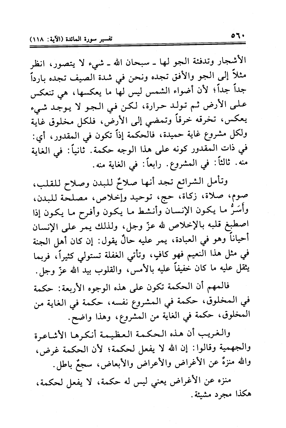 الأشجار وتدفئة الجو لها - سبحان الله - شيء لا يتصور، انظر مثلًا إلى الجو والأفق تجده ونحن في شدة الصيف تجده باردًا جدًّا جدًّا؛ لأن أضواء الشمس ليس لها ما يعكسها، هي تنعكس على الأرض ثم تولد حرارة، لكن في الجو لا يوجد شيء يعكس، تخرقه خرقًا وتمضي إلى الأرض، فلكل مخلوق غاية ولكل مشروع غاية حميدة، فالحكمة إذًا تكون في المقدور، أي: في ذات المقدور كونه على هذا الوجه حكمة. ثانيًا: في الغاية منه. ثالثًا: في المشروع. رابعًا: في الغاية منه.
