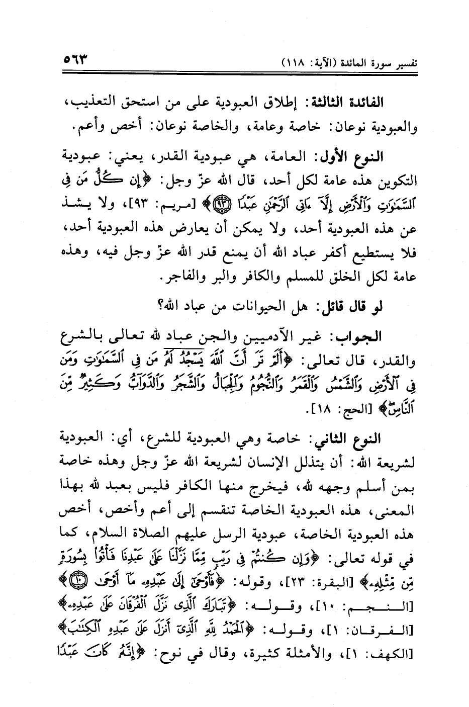 النوع الثاني: خاصة وهي العبودية للشرع، أي: العبودية لشريعة الله: أن يتذلل الإنسان لشريعة الله عزّ وجل وهذه خاصة بمن أسلم وجهه لله، فيخرج منها الكافر فليس بعبد لله بهذا المعنى، هذه العبودية الخاصة تنقسم إلى أعم وأخص، أخص هذه العبودية الخاصة، عبودية الرسل عليهم الصلاة السلام، كما في قوله تعالى: {وَإِنْ كُنْتُمْ فِي رَيْبٍ مِمَّا نَزَّلْنَا عَلَى عَبْدِنَا فَأْتُوا بِسُورَةٍ مِنْ مِثْلِهِ} [البقرة: ٢٣]، وقوله: {فَأَوْحَى إِلَى عَبْدِهِ مَا أَوْحَى (١٠)} [النجم: ١٠]، وقوله: {تَبَارَكَ الَّذِي نَزَّلَ الْفُرْقَانَ عَلَى عَبْدِهِ} [الفرقان: ١]، وقوله: {الْحَمْدُ لِلَّهِ الَّذِي أَنْزَلَ عَلَى عَبْدِهِ الْكِتَابَ} [الكهف: ١] , والأمثلة كثيرة، وقال في نوح: {إِنَّهُ كَانَ عَبْدًا