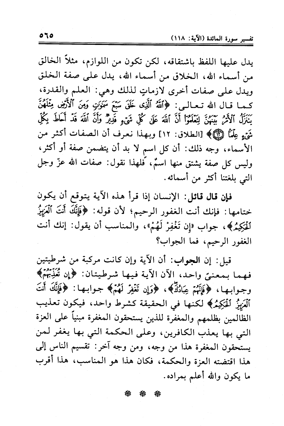 فإن قال قائل: الإنسان إذا قرأ هذه الآية يتوقع أن يكون ختامها: فإنك أنت الغفور الرحيم؛ لأن قوله: {فَإِنَّكَ أَنْتَ الْعَزِيزُ الْحَكِيمُ} , جوابـ "إِن تَغْفِرْ لَهُمْ"، والمناسب أن يقول: إنك أنت الغفور الرحيم، فما الجواب؟