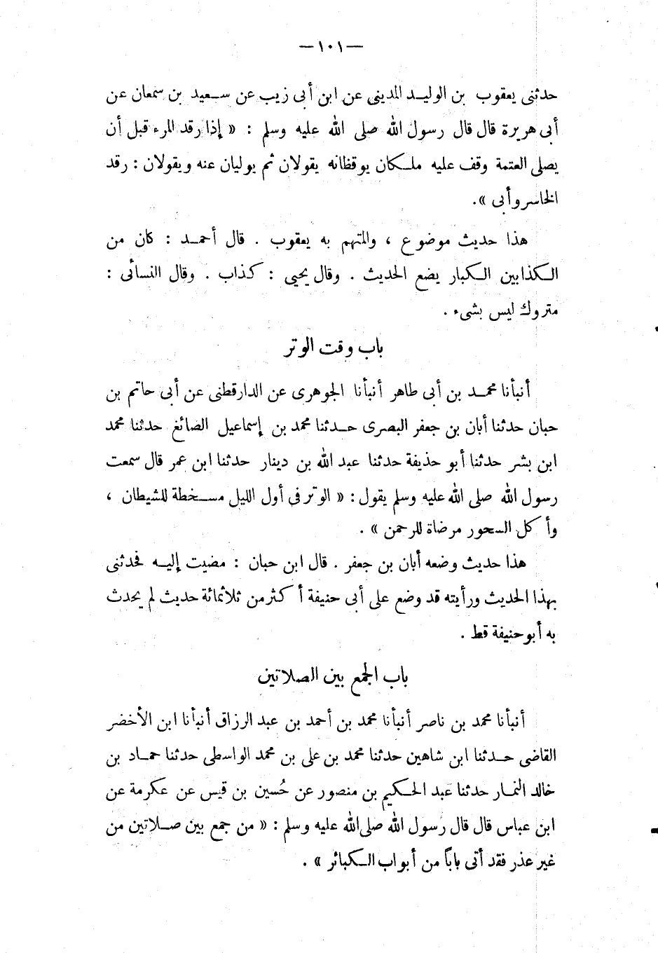 بَاب وَقت الْوتر أَنْبَأَنَا مُحَمَّدُ بْنُ أَبِي طَاهِرٍ أَنْبَأَنَا الْجَوْهَرِيُّ عَنِ الدَّارَقُطْنِيِّ عَنْ أَبِي حَاتِمِ بْنِ حَبَّانَ حَدَّثَنَا أَبَانُ بْنُ جَعْفَرٍ الْبَصْرِيُّ حَدَّثَنَا مُحَمَّدُ بْنُ إِسْمَاعِيلَ الصَّائِغُ حَدَّثَنَا مُحَمَّد ابْن بِشْرٍ حَدَّثَنَا أَبُو حُذَيْفَةَ حَدَّثَنَا عبد الله بْنُ دِينَارٍ حَدَّثَنَا ابْنُ عُمَرَ قَالَ سَمِعت رَسُول الله صَلَّى اللَّهُ عَلَيْهِ وَسَلَّمَ يَقُولُ: " الْوِتْرُ فِي أَوَّلِ اللَّيْلِ مَسْخَطَةٌ لِلشَّيْطَانِ، وَأَكْلُ السَّحُورِ مَرْضَاةٌ لِلرَّحْمَنِ ".
