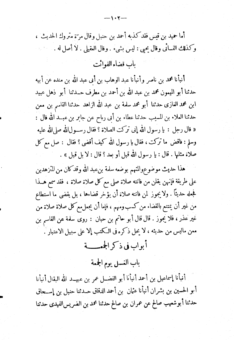 بَاب قَضَاء الْفَوَائِت أَنبأَنَا مُحَمَّدُ بْنُ نَاصِرٍ وَأَنْبَأَنَا عَبْدُ الْوَهَّاب بن أَبى عبد الله بْنِ مَنْدَهْ عَنْ أَبِيهِ حَدَّثَنَا أَبُو الميمون مُحَمَّد بن عبد الله بْنِ أَحْمَدَ بْنِ مُطَرِّفٍ حَدَّثَنَا أَبُو ذهل عبيد ابْن مُحَمَّدٍ الْغَازِي حَدَّثَنَا أَبُو مُحَمَّدٍ سَلمَة بن عبد الله الزّهْد حَدَّثَنَا الْقَاسِمُ بْنُ مَعْنٍ حَدَّثَنَا الْعَلاءُ بْنُ الْمُسَيِّبِ حَدَّثَنَا عَطَاءُ بْنُ أَبِي رَبَاحٍ عَنْ جَابِرِ بن عبد الله قَالَ: " قَالَ رَجُلٌ: يَا رَسُولَ اللَّهِ إِنِّي تَرَكْتُ الصَّلاةَ؟ فَقَالَ رَسُول الله صَلَّى اللَّهُ عَلَيْهِ وَسَلَّمَ: فَاقْضِ مَا تَرَكْتَ، فَقَالَ يَا رَسُولَ اللَّهِ كَيْفَ أَقْضِي؟ فَقَالَ: صَلِّ مَعَ كُلِّ صَلاةٍ مِثْلَهَا.