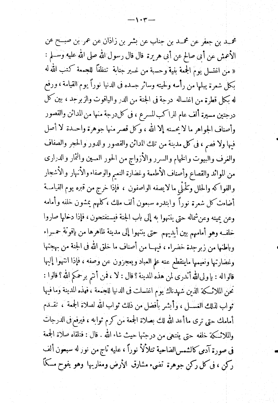 مُحَمَّدُ بْنُ جَعْفَرٍ عَنْ مُحَمَّدِ بْنِ جَنَابٍ عَنْ بِشْرِ بْنِ زَاذَانَ عَنْ عُمَرَ بْنِ صُبْحٍ عَنِ الأَعْمَشِ عَنْ أَبِي صَالِحٍ عَنْ أَبِي هُرَيْرَةَ قَالَ قَالَ رَسُول الله صَلَّى اللَّهُ عَلَيْهِ وَسَلَّمَ: " مَنِ اغْتَسَلَ يَوْم الْجُمُعَةِ بِنِيَّةٍ وَحِسْبَةٍ مِنْ غَيْرِ جَنَابَةٍ تَنَظُّفًا لِلْجُمُعَةِ كَتَبَ اللَّهُ لَهُ بِكُلِّ شَعْرَةٍ يَبُلُّهَا مِنْ رَأْسِهِ وَلِحْيَتِهِ وَسَائِرِ جَسَدِهِ فِي الدُّنْيَا نُورًا يَوْمَ الْقِيَامَةِ، وَرَفَعَ لَهُ بِكُلِّ قَطْرَةٍ مِنَ اغْتِسَالِهِ دَرَجَةً فِي الْجَنَّةِ مِنَ الدُّرِّ وَالْيَاقُوتِ وَالزَّبَرْجَدِ، بَيْنَ كُلِّ دَرَجَتَيْنِ مَسِيرَةُ أَلْفِ عَامٍ لِلرَّاكِبِ الْمُسْرِعِ، فِي كُلِّ دَرَجَةٍ مِنْهَا مِنَ الْمَدَائِنِ وَالْقُصُورِ وَأَصْنَافِ الْجَوَاهِرِ مَا لَا يُحْسِنُهُ إِلا اللَّهُ، وَكُلُّ قَصْرٍ مِنْهَا جَوْهَرَةٌ وَاحِدَةٌ لَا أَصْلَ فِيهَا وَلا فَصْمَ، فِي كُلِّ مَدِينَةٍ مِنْ تِلْكَ الْمَدَائِنِ وَالْقُصُورِ وَالدُّورِ وَالْحَجَرِ وَالصِّفَافِ وَالْغُرَفِ وَالْبُيُوتِ وَالْخِيَامِ وَالسُّرُرِ وَالأَزْوَاجِ مِنَ الْحُورِ الْعِينِ وَالثِّمَارِ وَالدَّرَارِيِّ مِنَ الْمَوَائِدِ وَالْقِصَاعِ وَأَصْنَافِ الأَطْعِمَةِ وَغَضَارَةِ النَّعِيمِ وَالْوُصَفَاءِ وَالأَنْهَارِ وَالأَشْجَارِ وَالْفَوَاكَهِ وَالْحُلَلِ ولحلى مَا لَا يصفه والواصفون، فَإِذَا خَرَجَ مِنْ قَبْرِهِ يَوْمَ الْقِيَامَةِ أَضَاءَتْ كُلُّ شَعْرَةٍ نُورًا وَابْتَدَرَهُ سَبْعُونَ أَلْفَ مَلَكٍ، كُلُّهُمْ يَمْشُونَ خَلْفَهُ وَأَمَامَهُ وَعَنْ يَمِينِهِ وَعَنْ شِمَالِهِ حَتَّى يَنْتَهُوا بِهِ إِلَى بَابِ الْجَنَّةِ فَيَسْتَفْتِحُونَ، فَإِذَا دَخَلَهَا صَارُوا خَلْفَهُ وَهُوَ أَمَامَهُمْ بَيْنَ أَيْدِيهِمْ حَتَّى يَنْتَهُوا إِلَى مَدِينَةٍ ظَاهِرُهَا مِنْ يَاقُوتَةٍ حَمْرَاءَ وباطنها من زبر جدة خَضْرَاءَ، فِيهَا مِنْ أَصْنَافِ مَا خَلَقَ اللَّهُ فِي الْجَنَّةِ مِنْ بَهْجَتِهَا وَغَضَارَتِهَا وَنَعِيمِهَا مَا يَنْقَطِعُ عَنْهُ عِلْمُ الْعِبَادِ وَيَعْجَزُونَ عَنْ وَصْفِهِ، فَإِذَا انْتَهَوْا إِلَيْهَا قَالُوا لَهُ: يَا وَلِيَّ اللَّهِ أَتَدْرِي لِمَنْ هَذهِ الْمَدِينَةُ؟ قَالَ: لَا، فَمَنْ أَنْتُمْ يَرْحَمُكُمُ اللَّهُ؟ قَالُوا: نَحْنُ الْمَلائِكَةُ الَّذِينَ شَهِدْنَاكَ يَوْمَ اغْتَسَلْتَ فِي الدُّنْيَا لِلْجُمُعَةِ، فَهَذِهِ الْمَدِينَةُ وَمَا فِيهَا ثَوَابٌ لِذَلِكَ الْغُسْلِ، وَأَبْشِرْ بِأَفْضَلَ مِنْ ذَلِكَ ثَوَابُ اللَّهِ لِصَلاةِ الْجُمُعَةِ، تَقَدَّمْ أَمَامَكَ حَتَّى تَرَى مَا أَعَدَّ اللَّهُ لَكَ بِصَلاةِ الْجُمُعَةِ مِنْ كَرَمِ ثَوَابِهِ، فَيَرْفَعُ فِي الدَّرَجَاتِ وَالْمَلائِكَةُ خَلْفَهُ حَتَّى يَنْتَهِيَ مِنْ دَرَجَتِهَا حَيْثُ شَاءَ اللَّهُ.